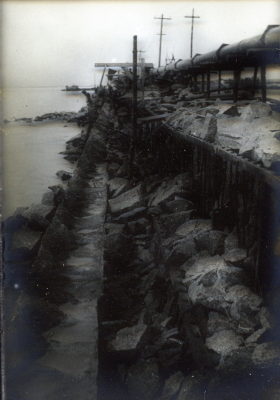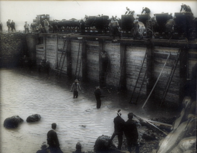 Bouw van een dijk of zeewering in gebied nabij de Go...