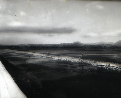 Polderdijk in aanleg, misschien in Japan.
