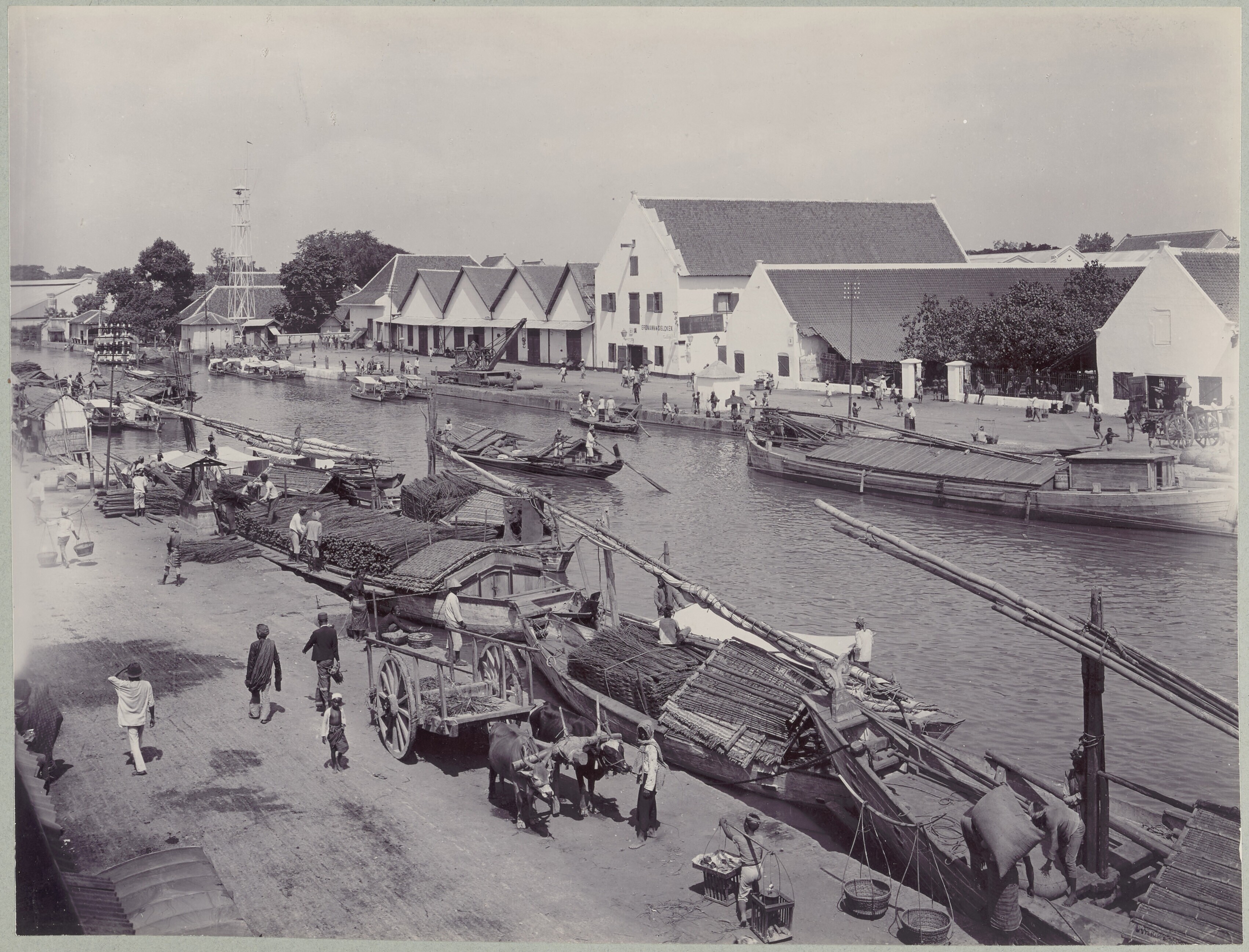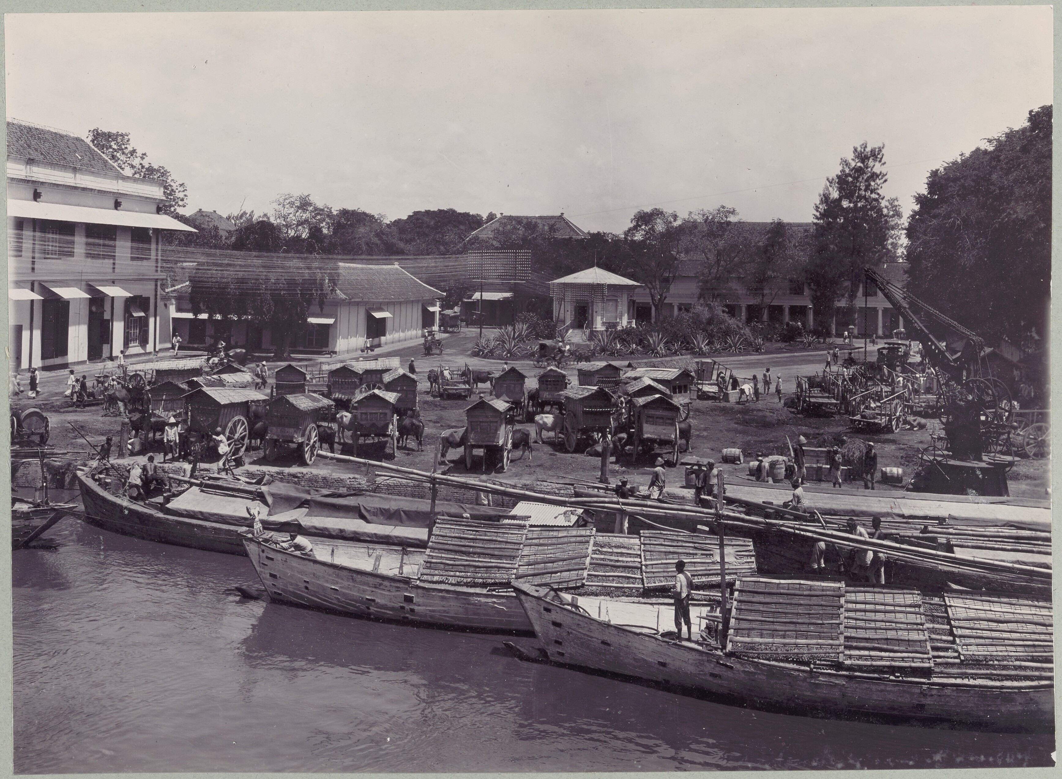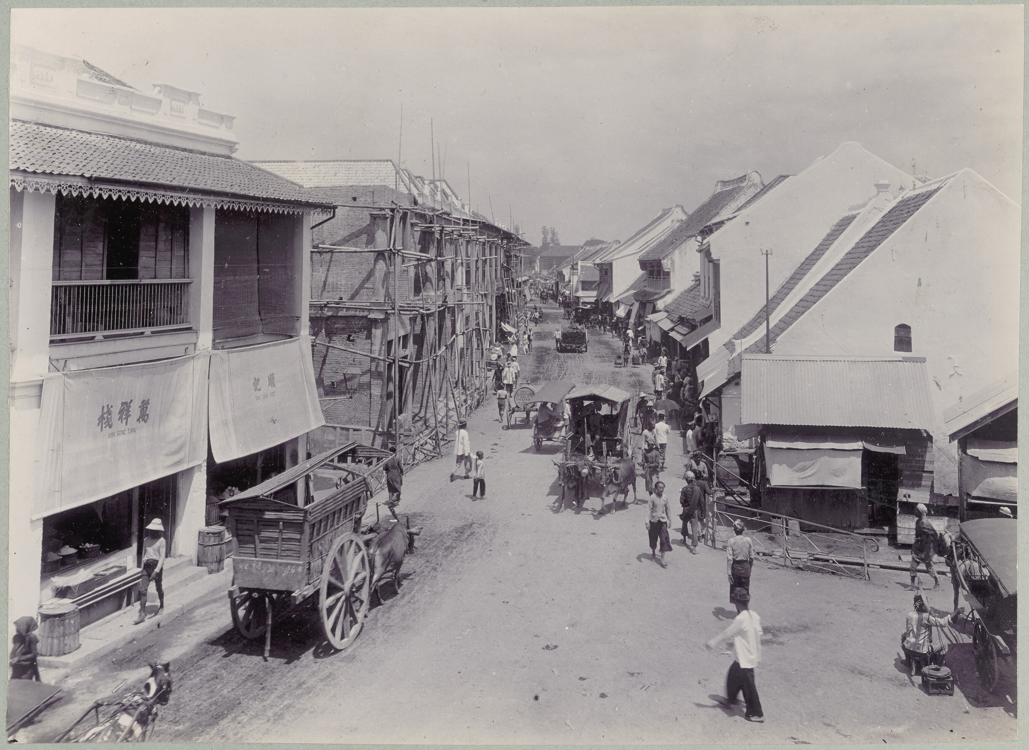 Mensen en ossenkarren in een straat in Soerabaja, me...