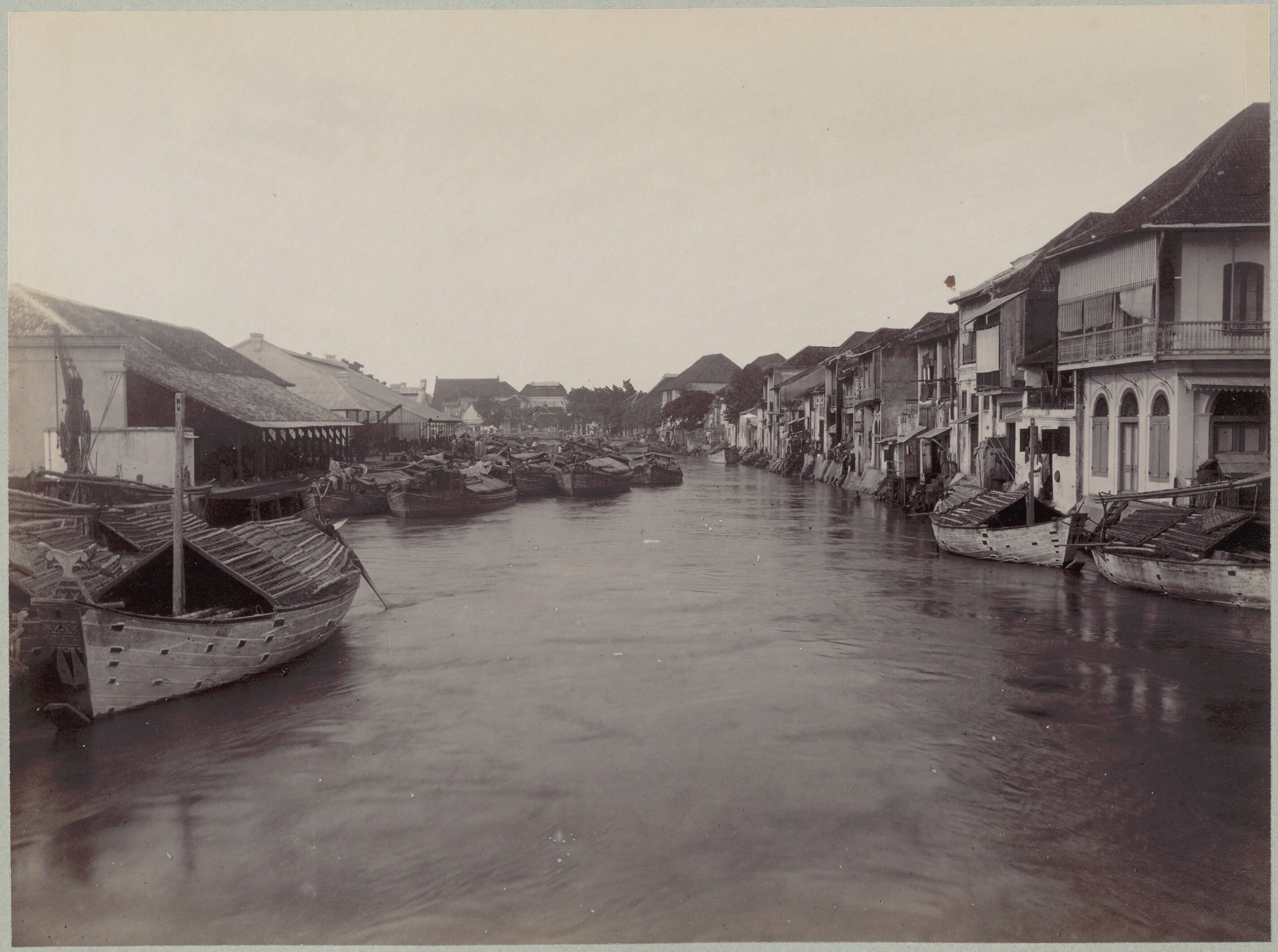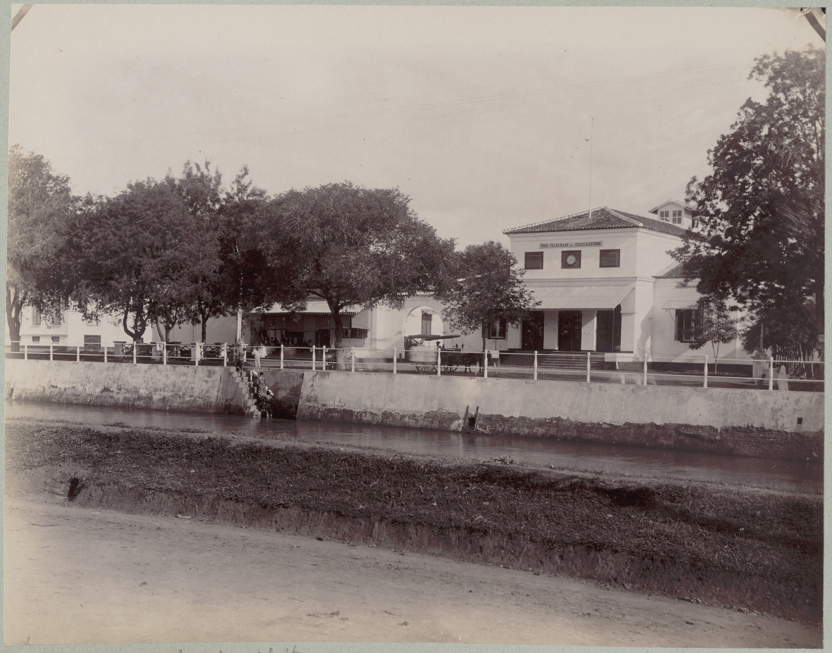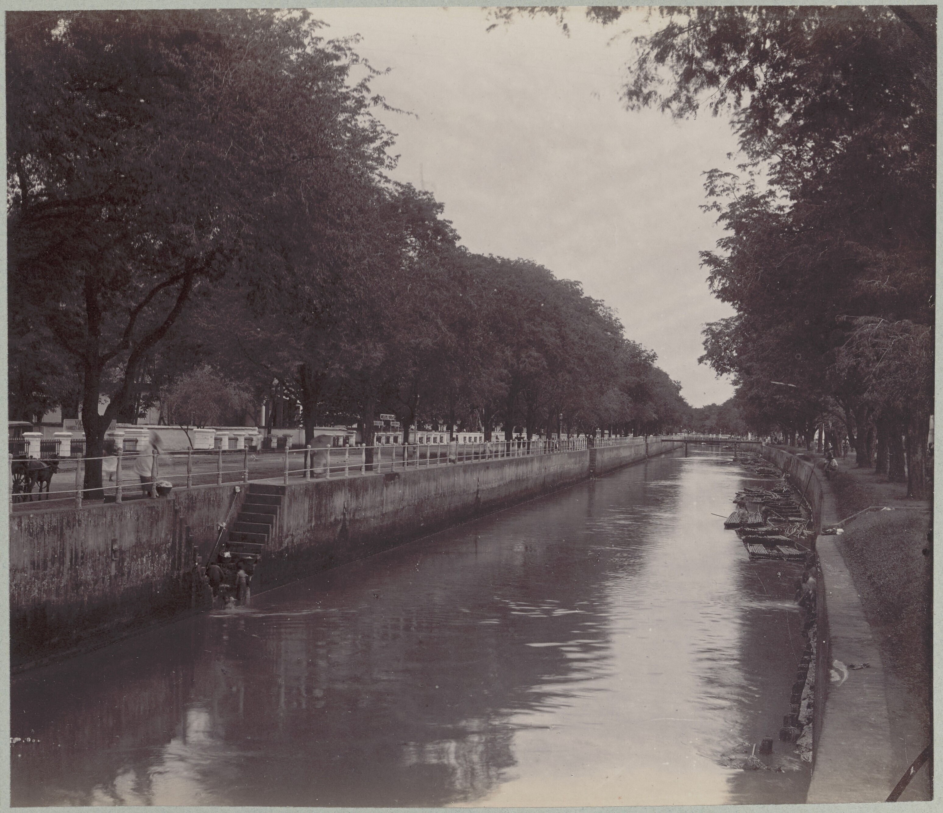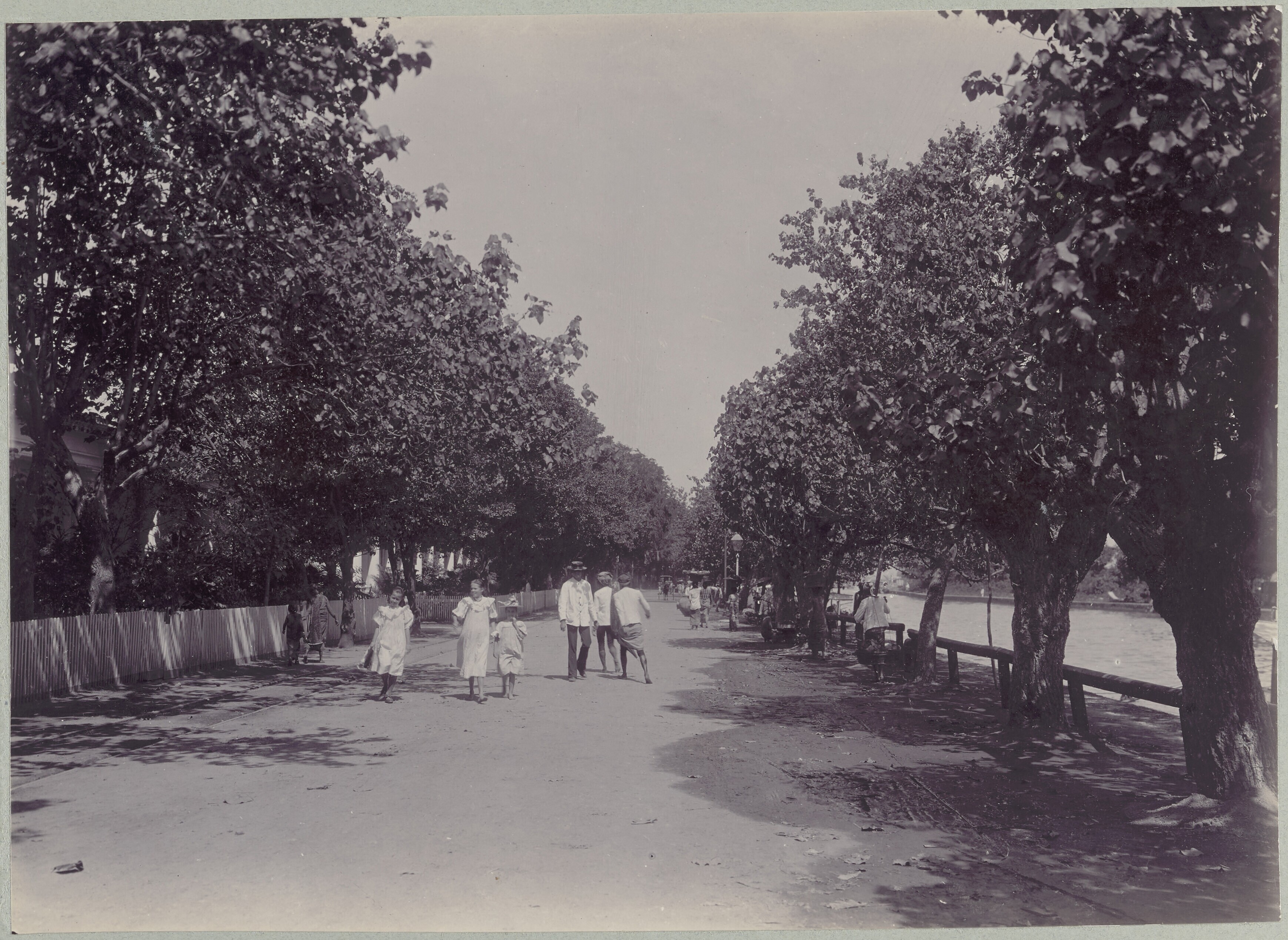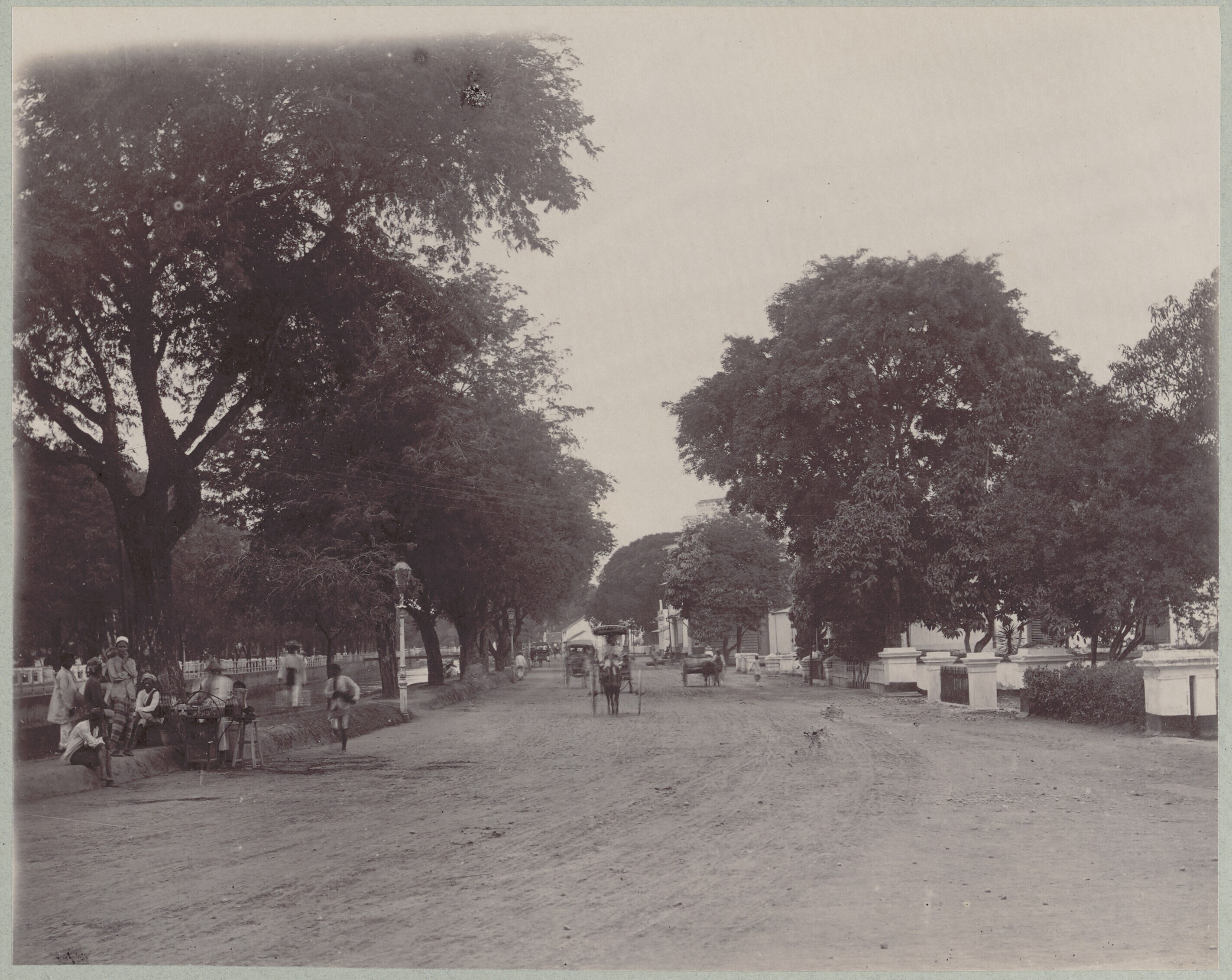 Gezicht op een straat met links een rivier te Batavia