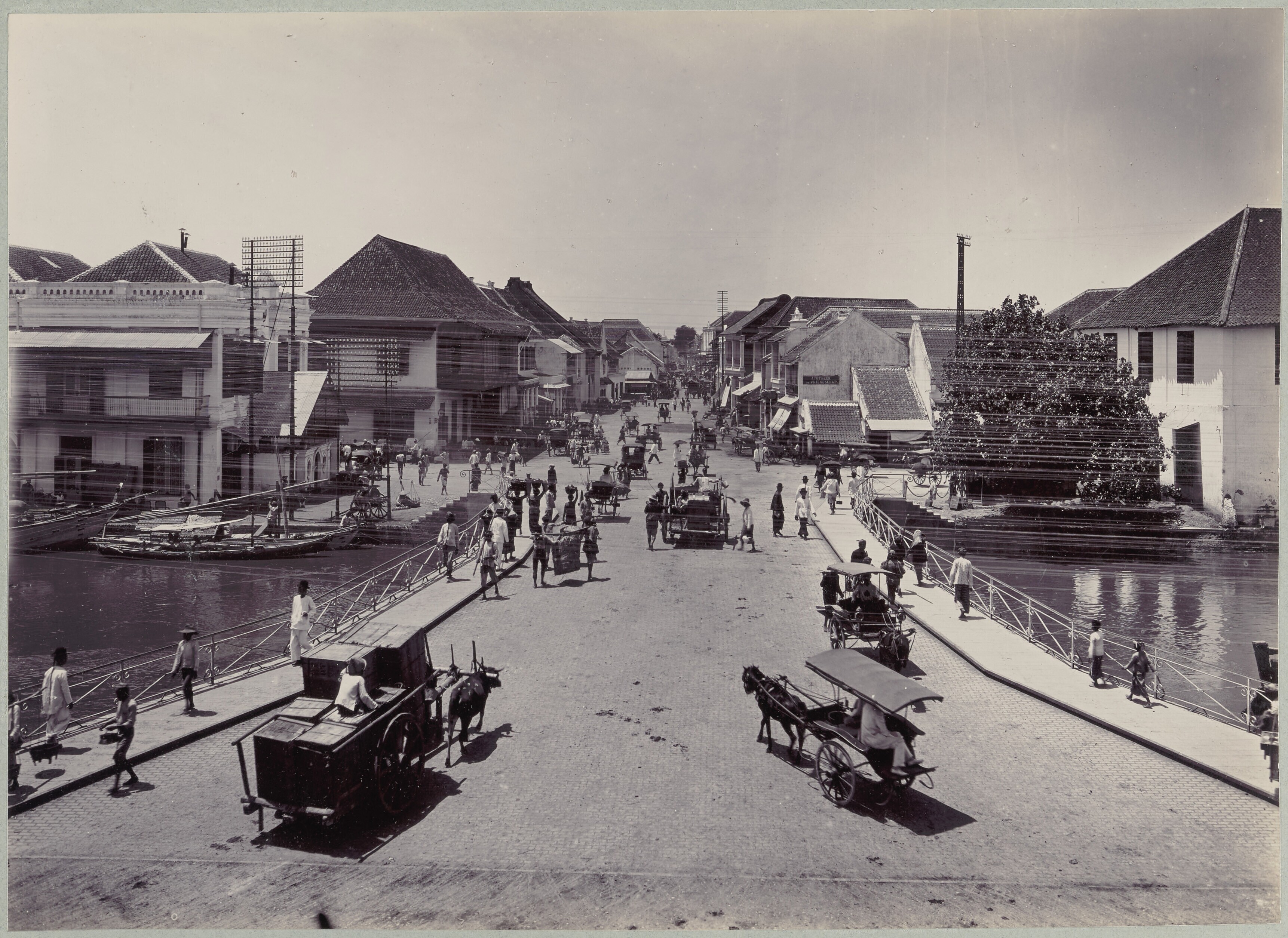 Gezicht op de brug met ossenkarren en paardenrijtuig...