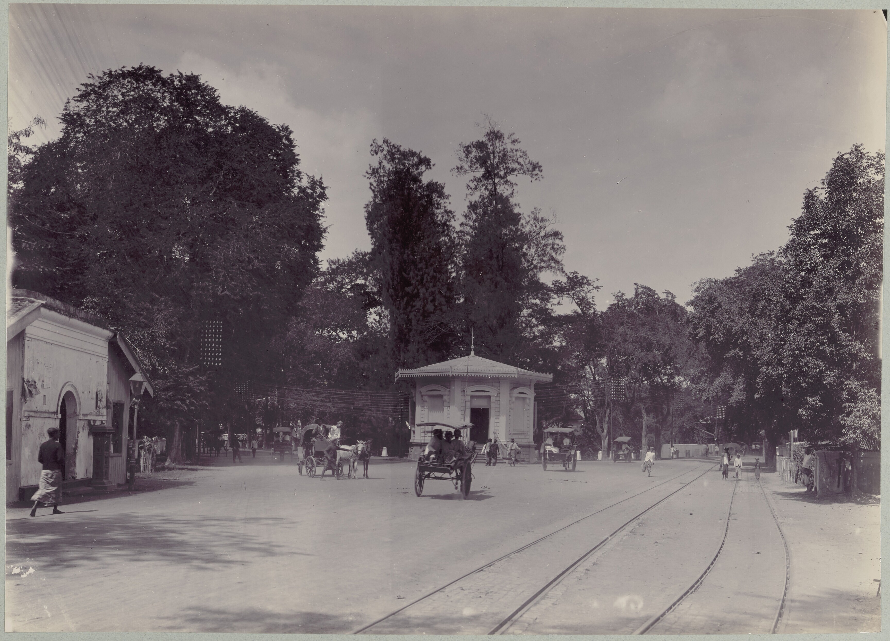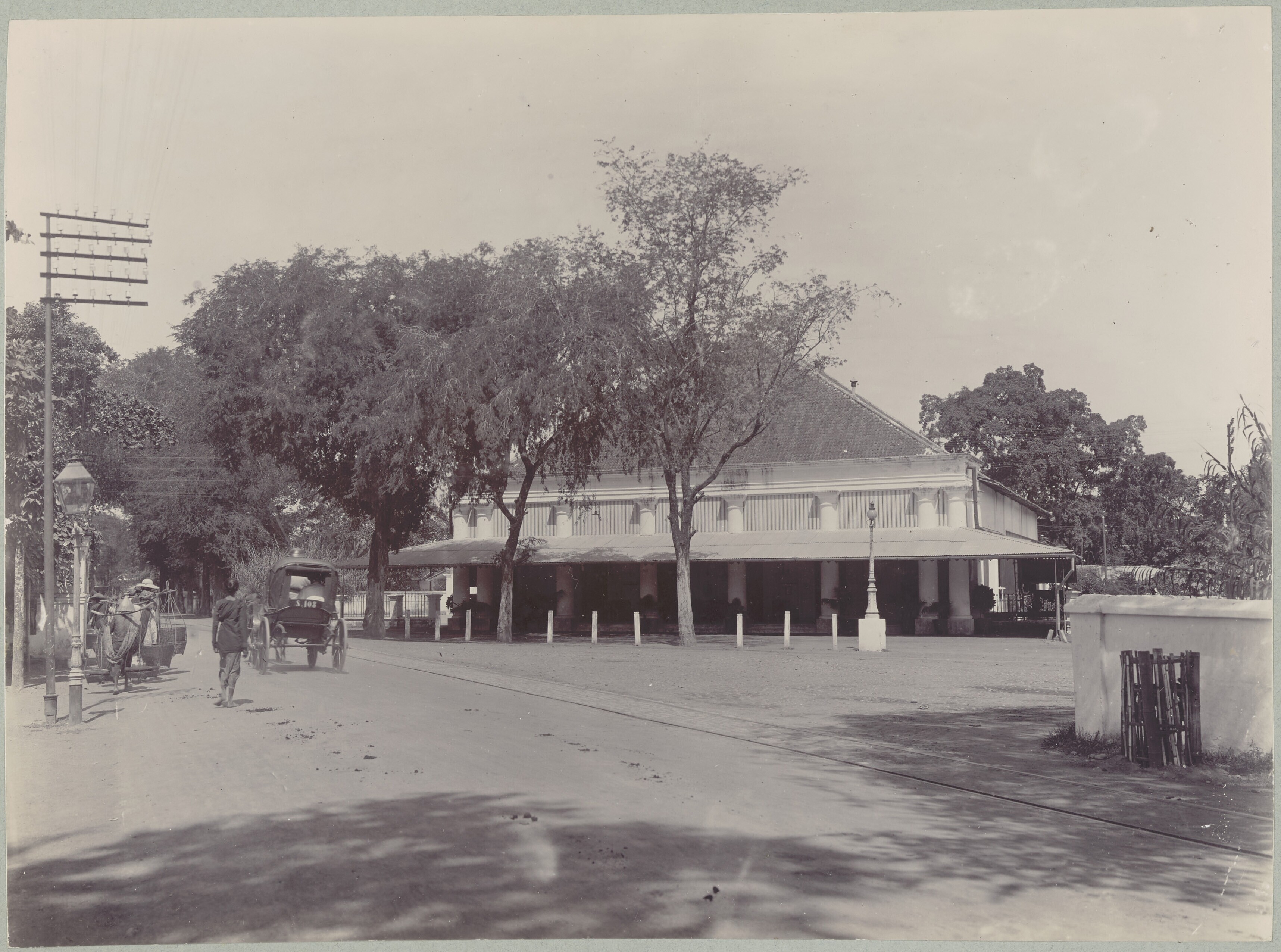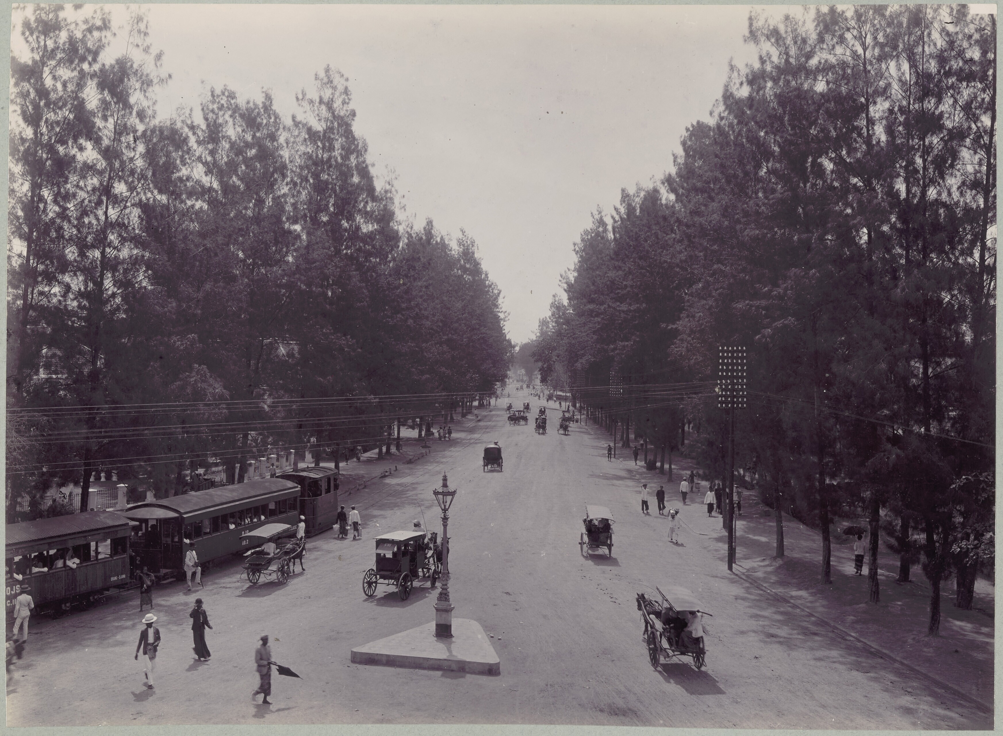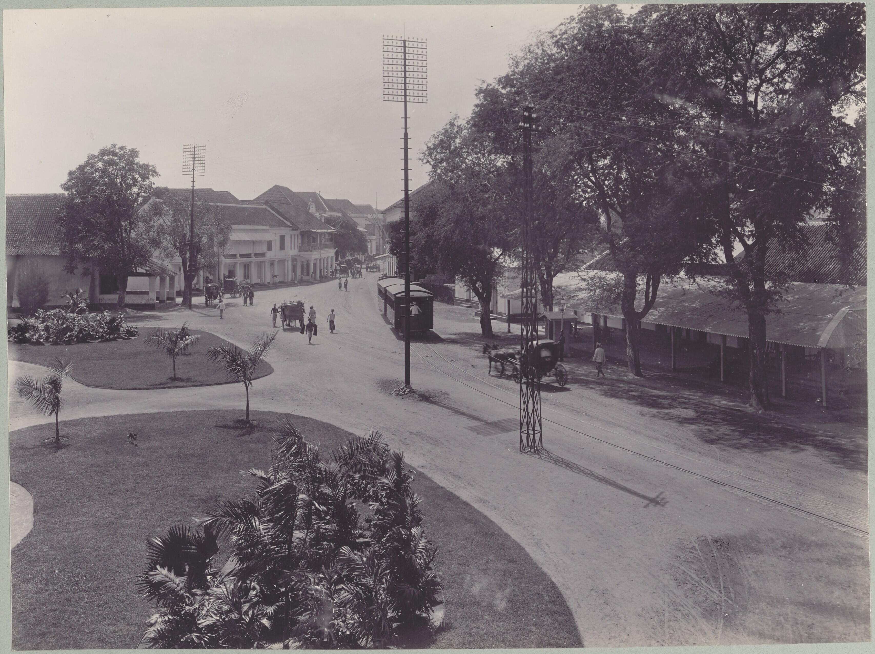 Gezicht op een straat in Soerabaja met een stoomtram...