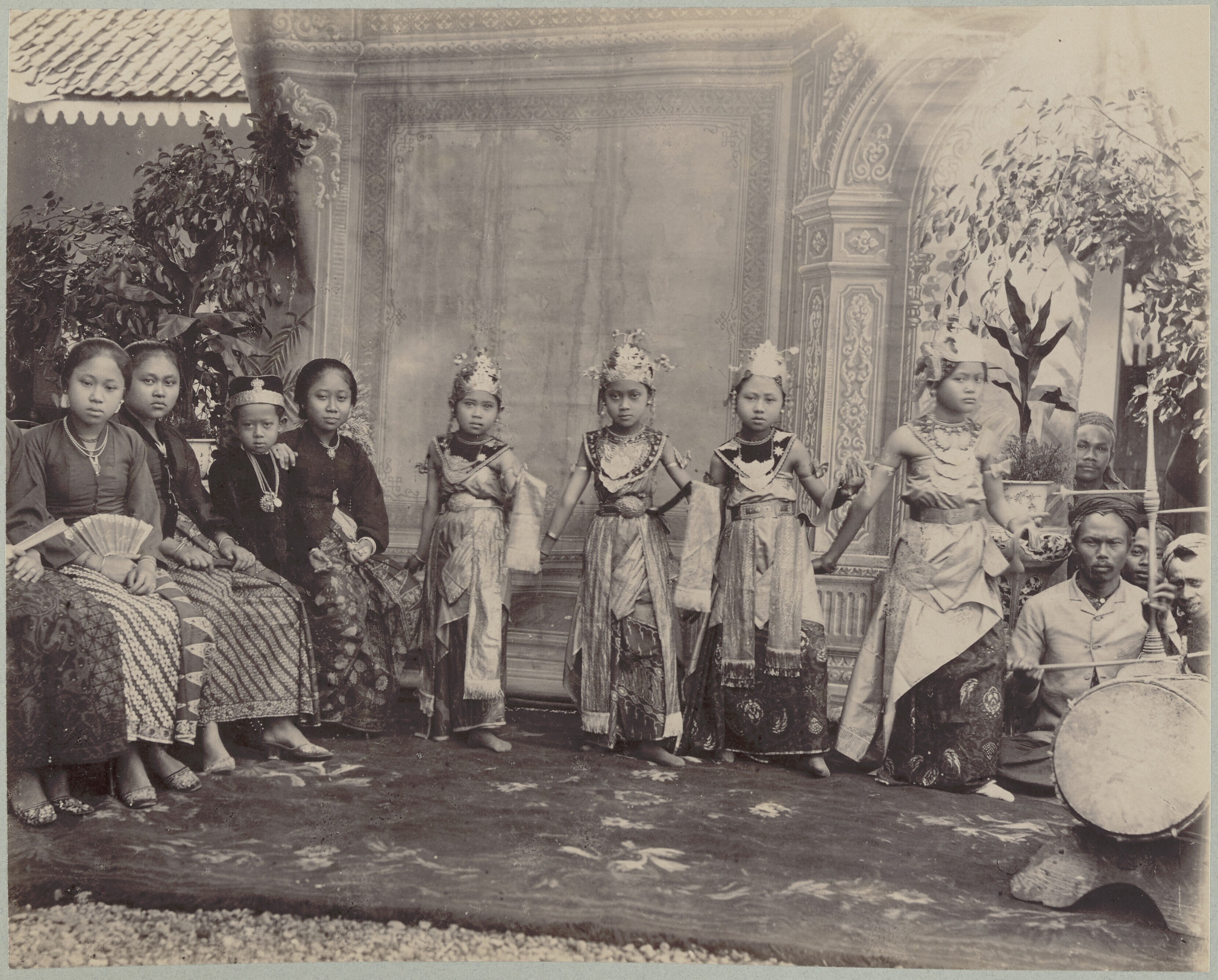 Groep Javaanse danseressen met man en trommel