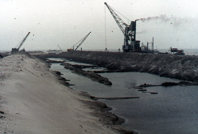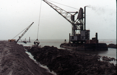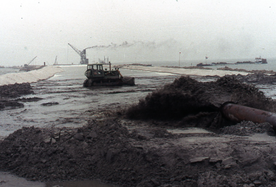 Opspuiten van zand in een ringdijk, vermoedelijk van...