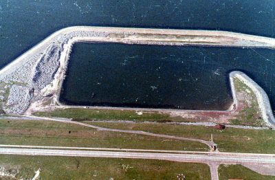 Luchtfoto van een werkhaven bij de Afsluitdijk.