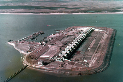 Luchtfoto van een werkeiland in het Haringvliet. Het...