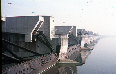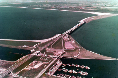 Luchtfoto van de Haringvlietdam met sluiscomplex en ...
