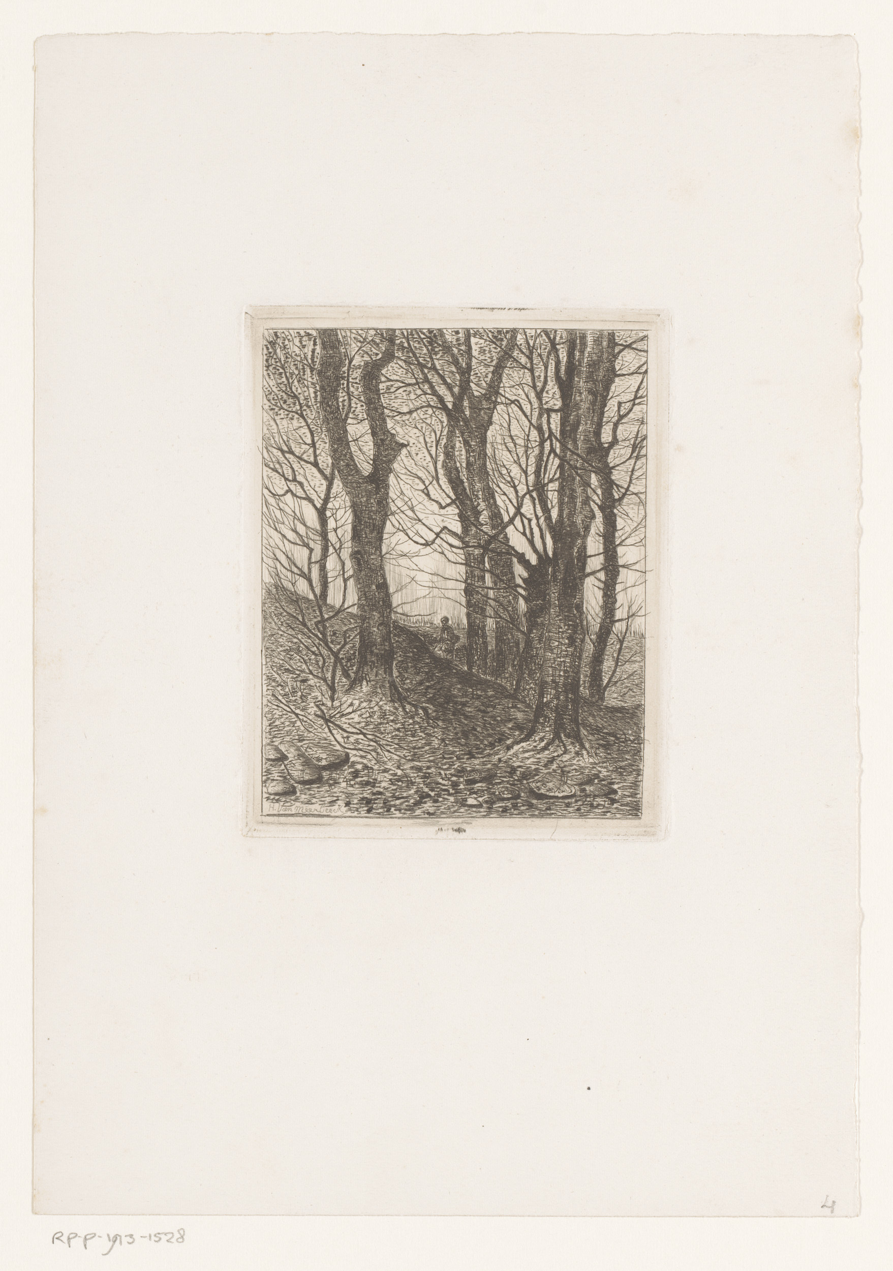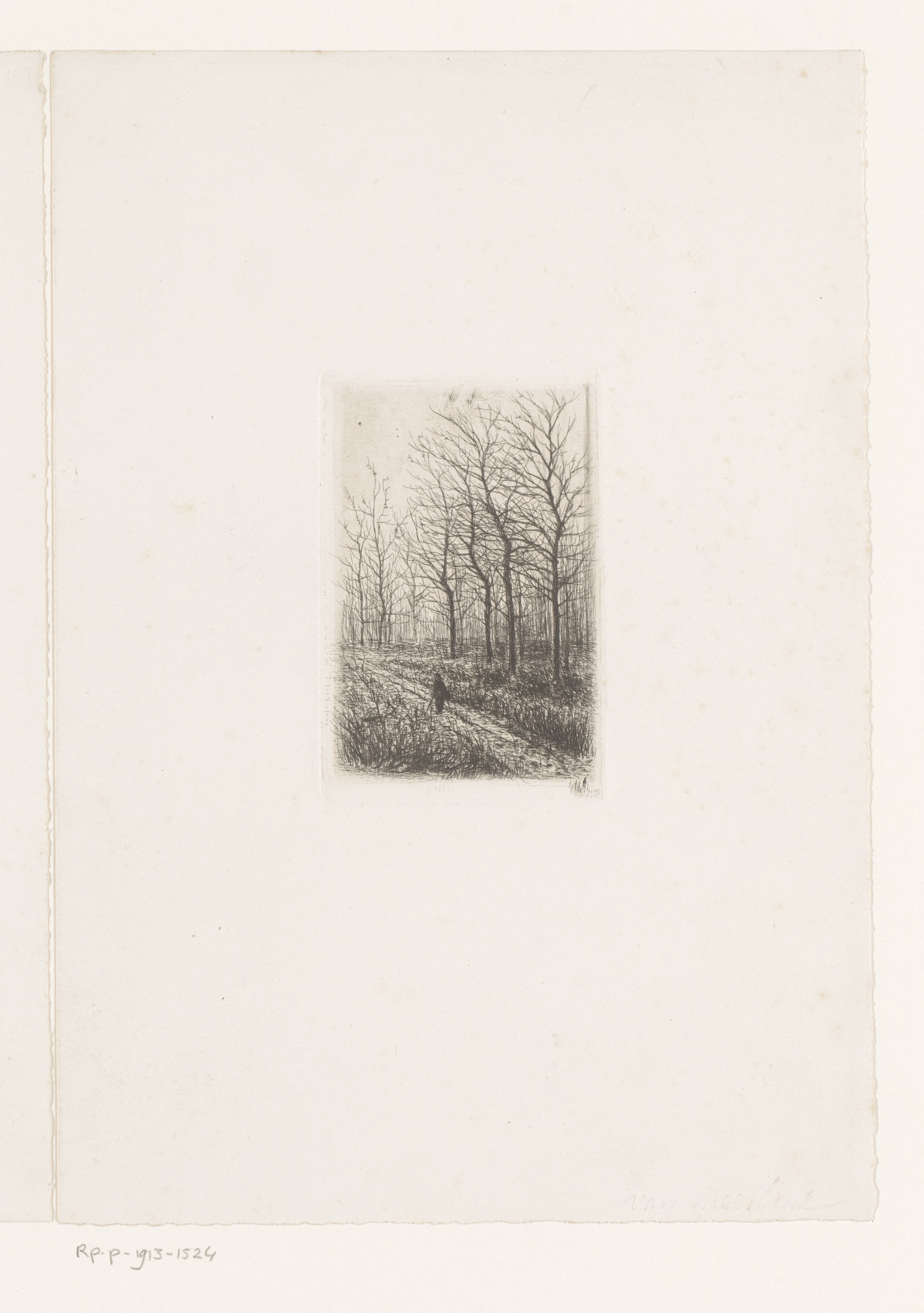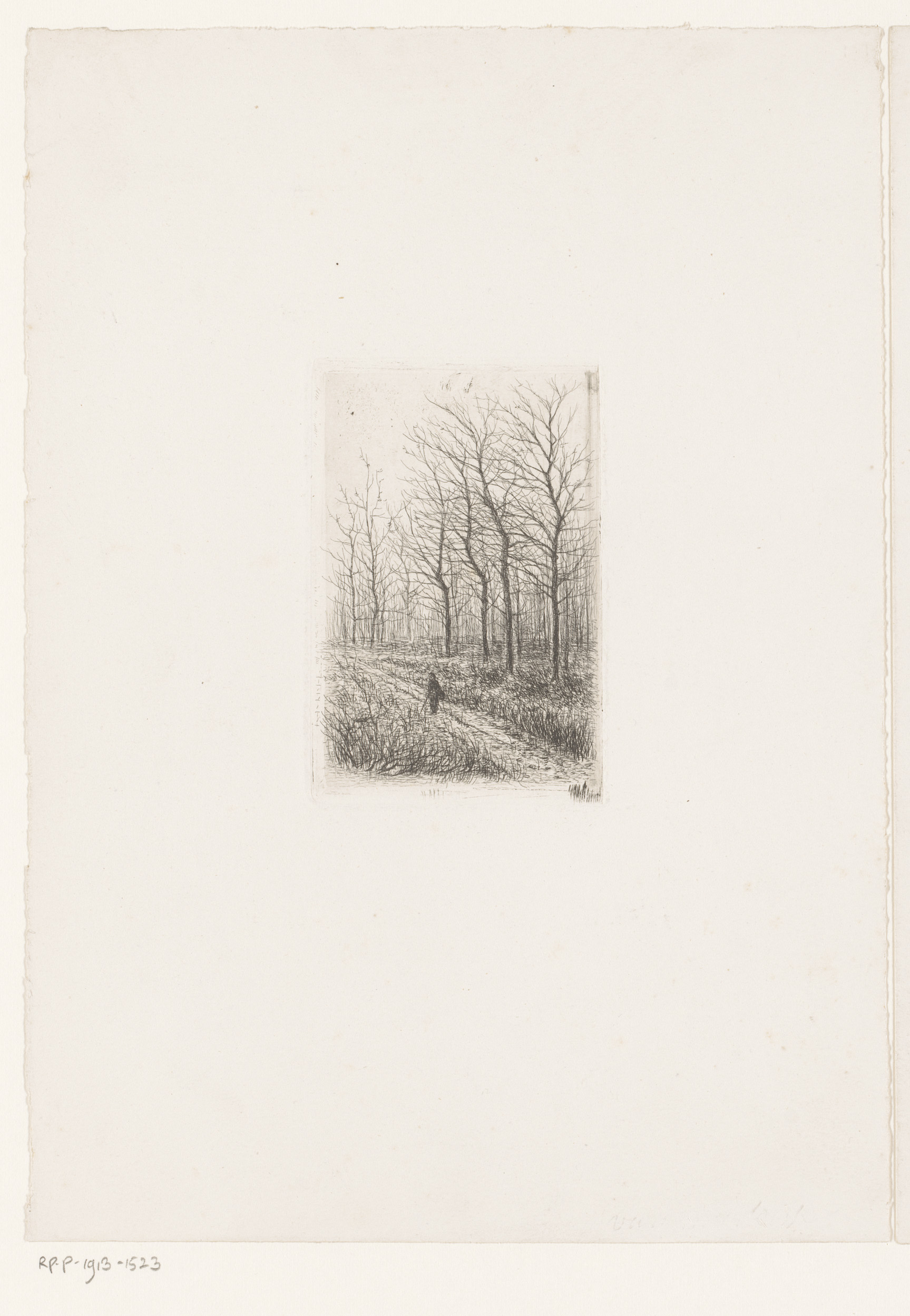 Landschap met kale bomen en een figuur met wandelstok