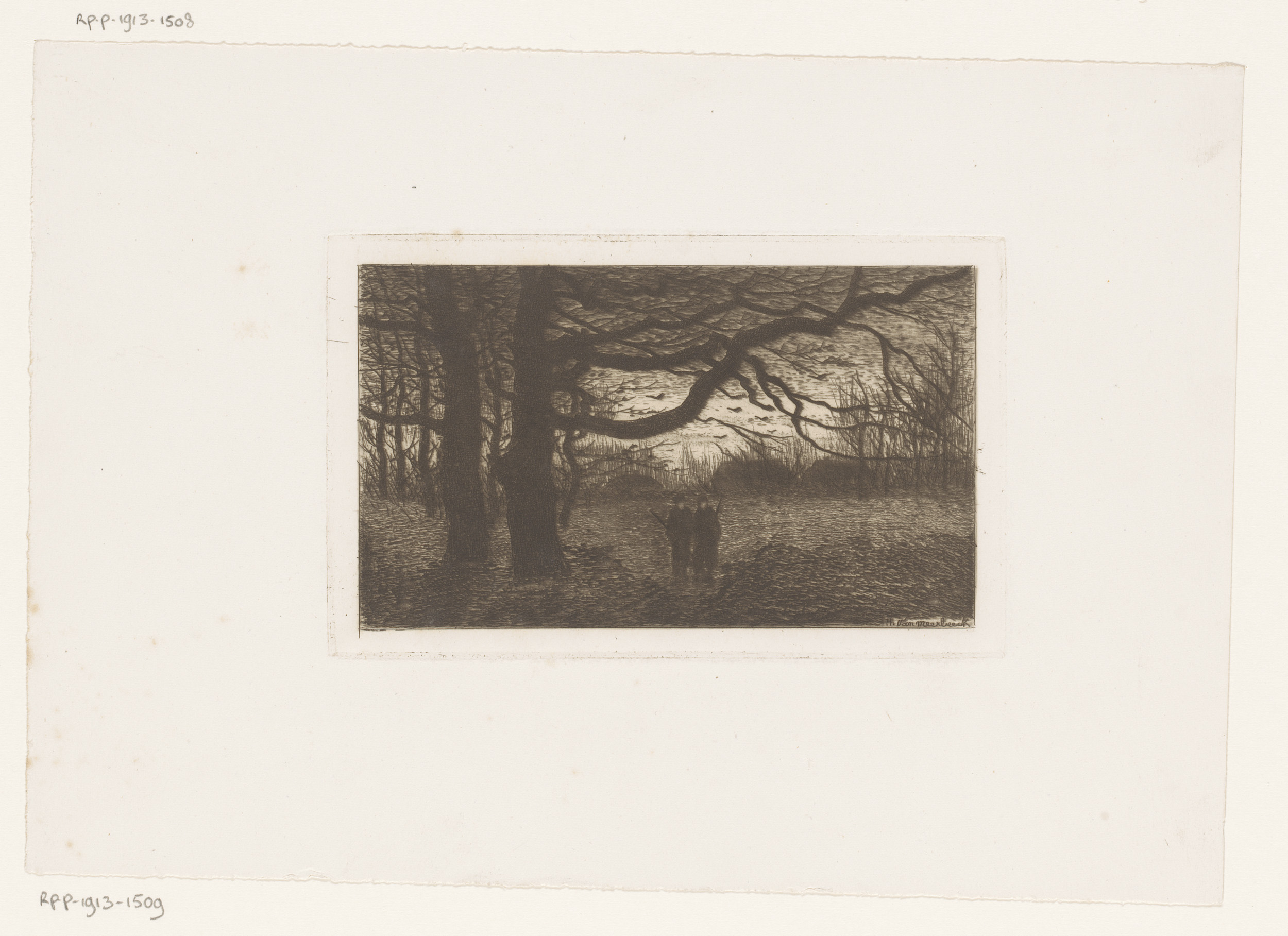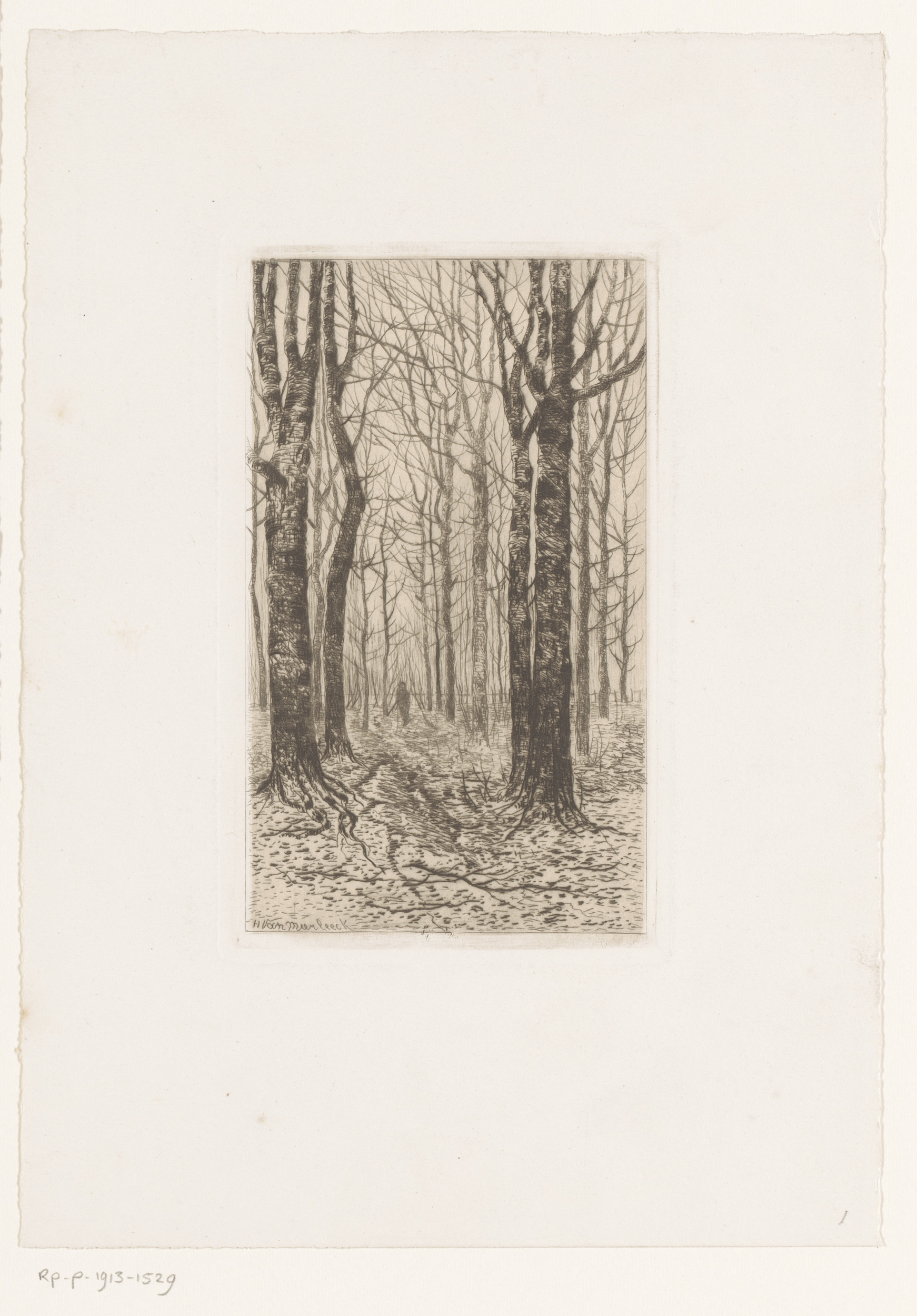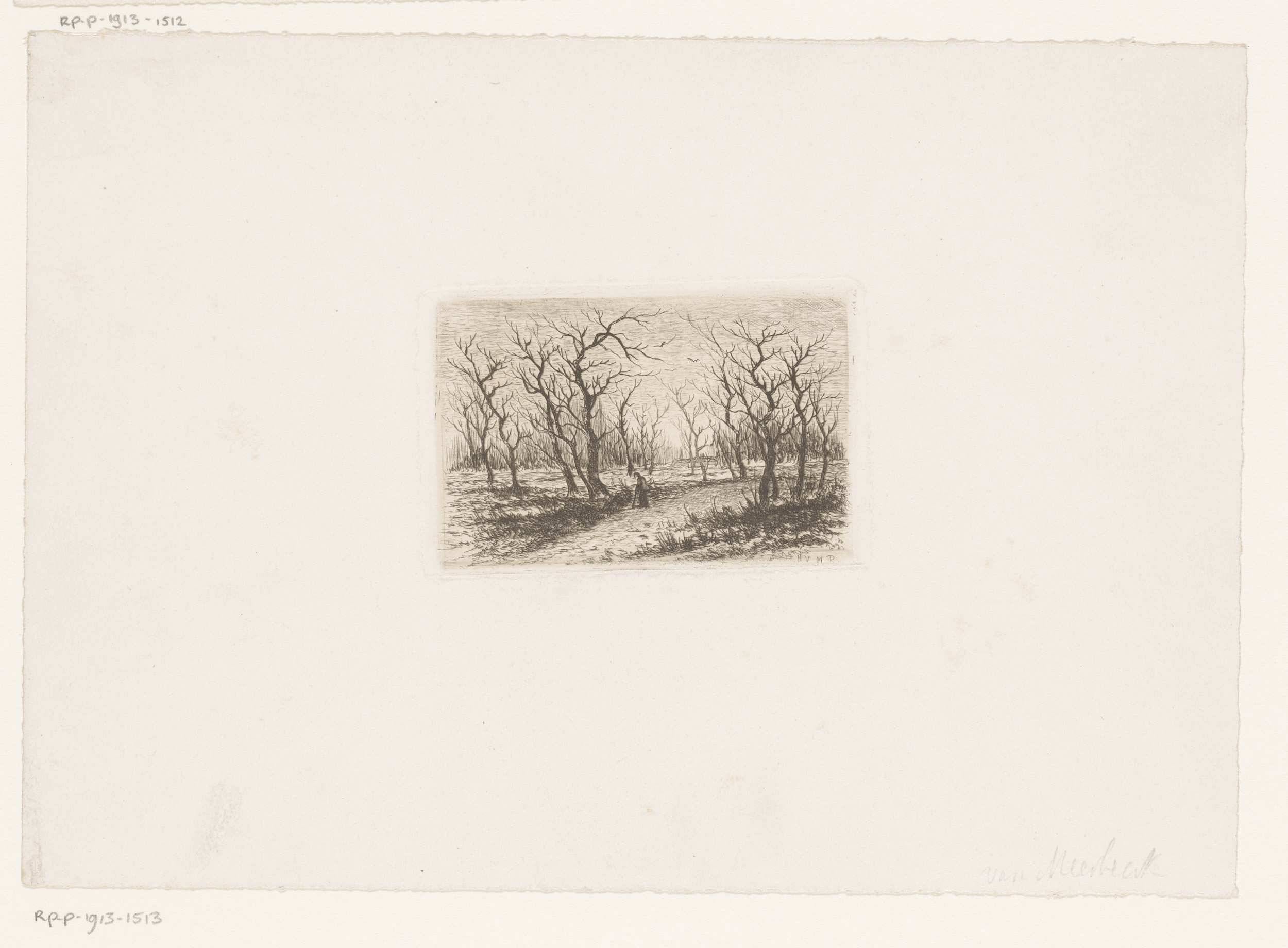 Landschap met kale bomen en een figuur met wandelstok