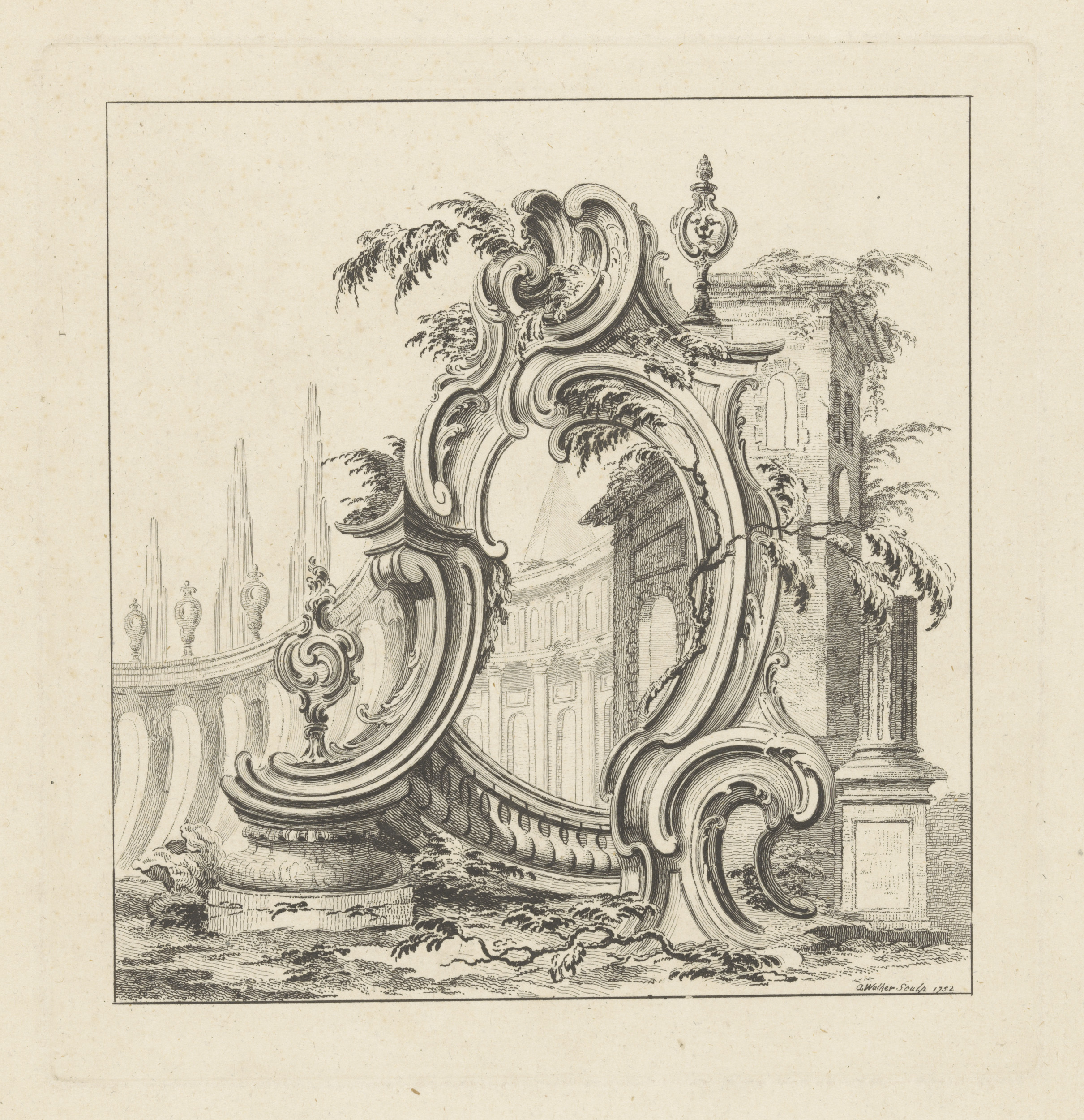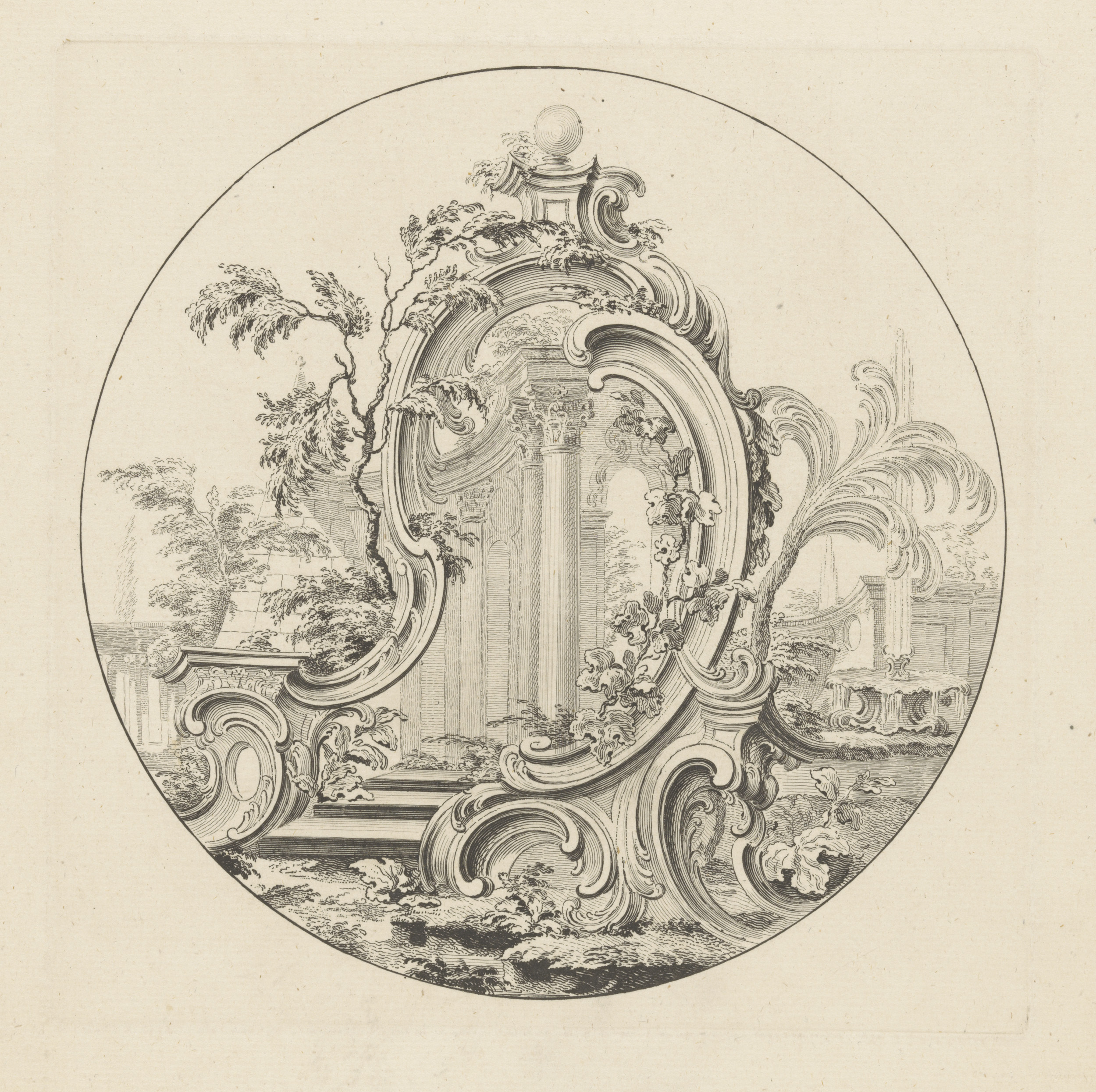 Cartouche in landschap met colonnades