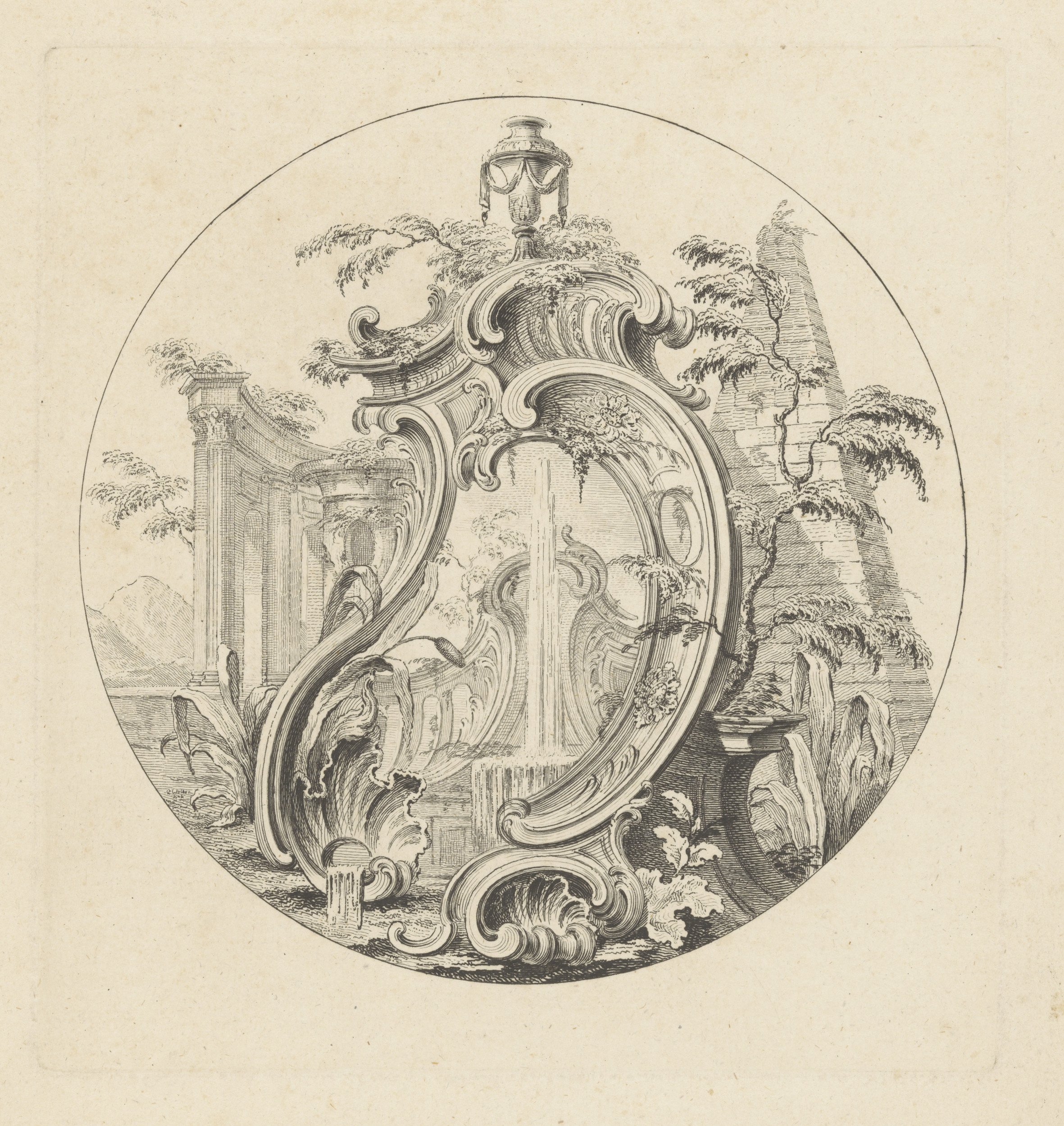 Cartouche in landschap met colonnade
