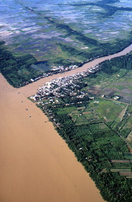 Luchtfoto van laagland in Vietnam met bebouwing aan ...
