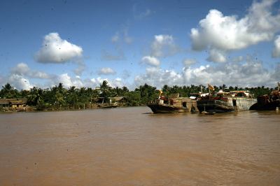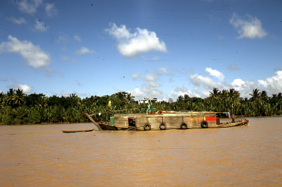 Boot op een rivier in Vietnam, met op de achtergrond...
