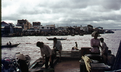 Rivier met bootjes in Vietnam, juli 1974.