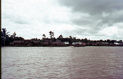 Rivier in Vietnam met bebouwing aan de oevers, 1970.