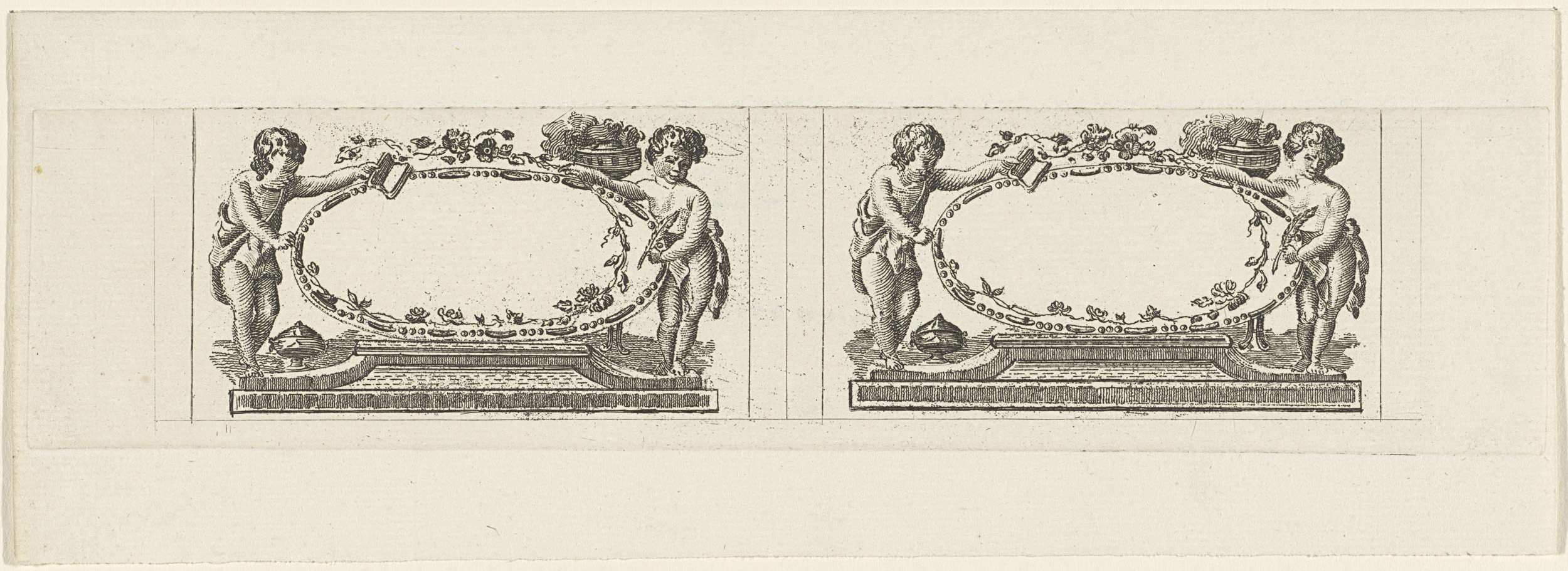 Figuren in een landschap, monument en putti op wolken
