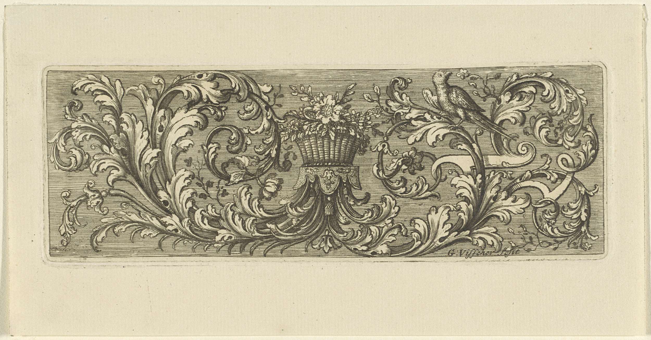 Bloemenmand ten midden van bladranken met een vogel