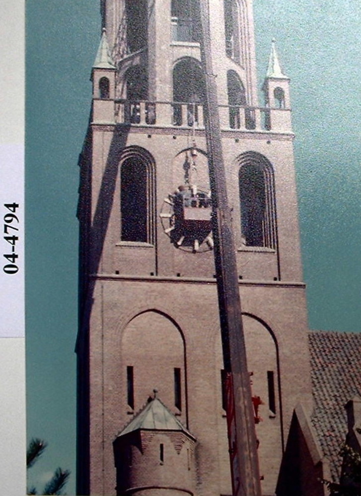 Het aanbrengen van de wijzerplaat in de toren van de...