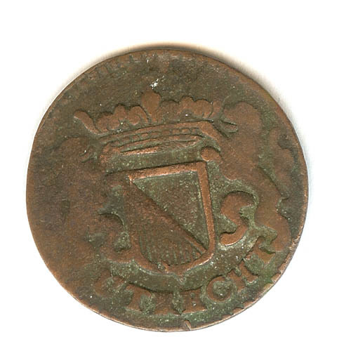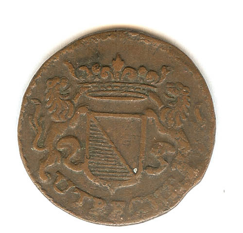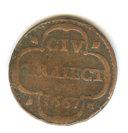 Duit met op de voorzijde versierde vierpas CIV TRAIE...