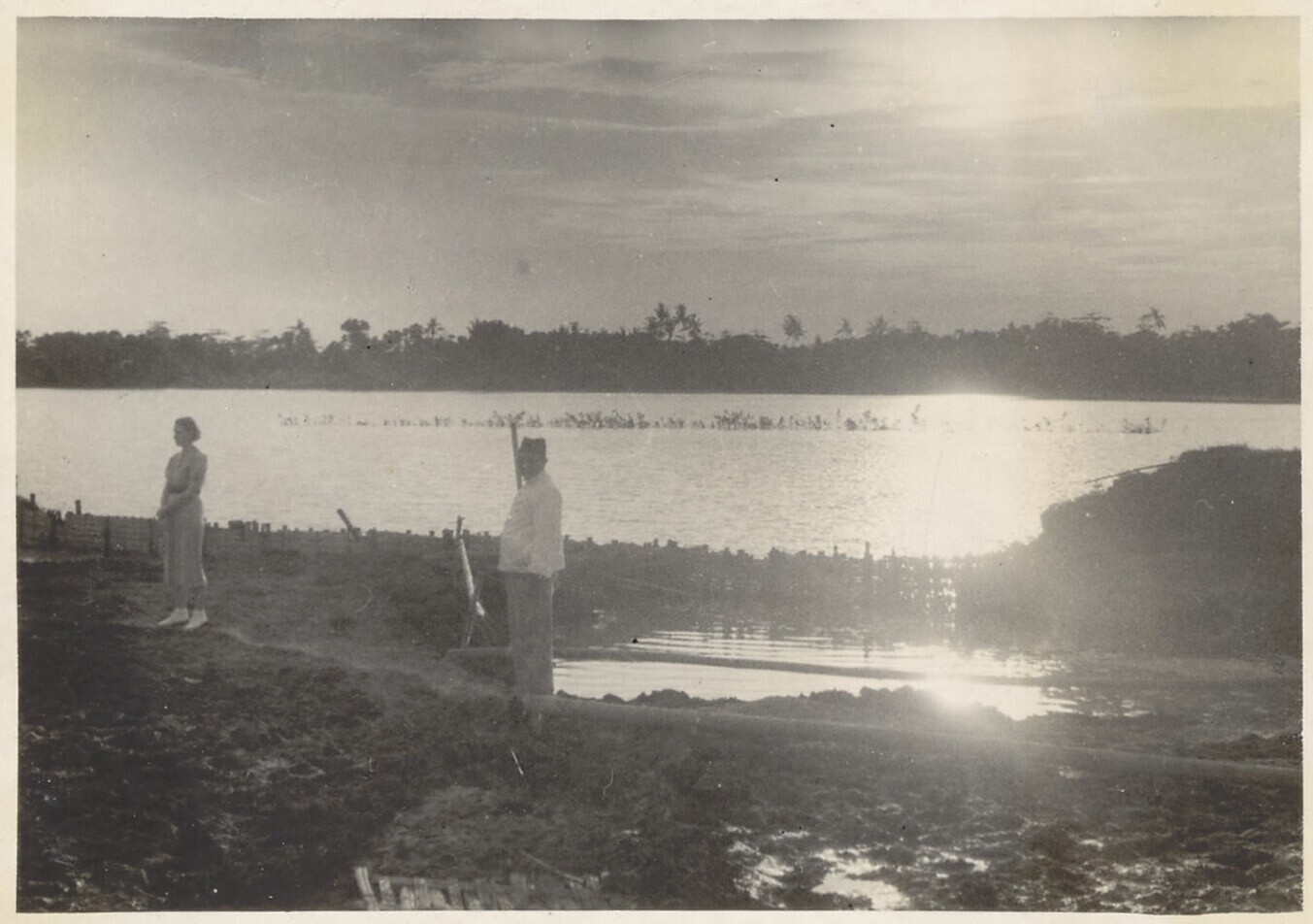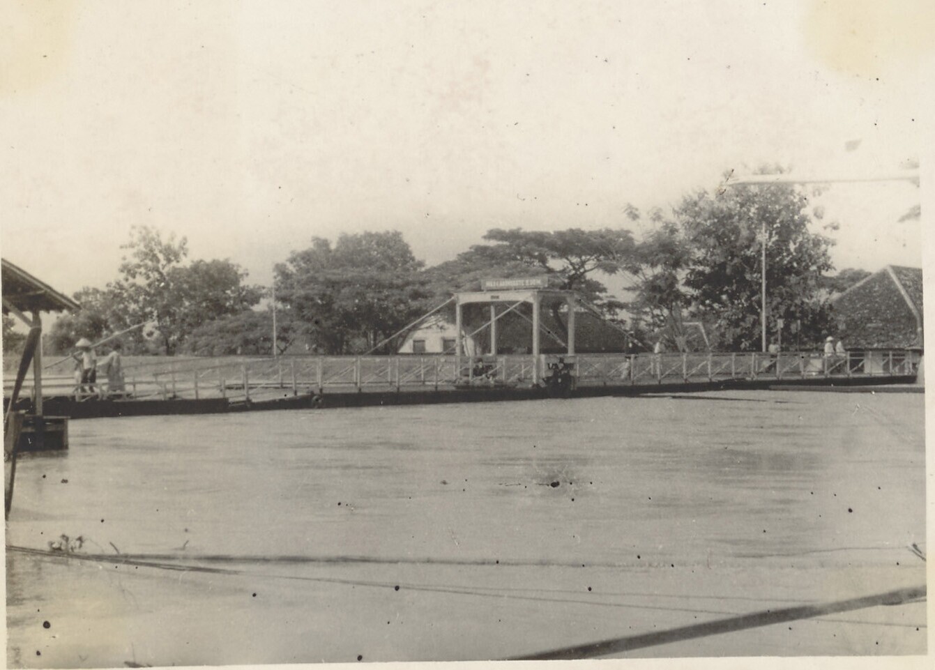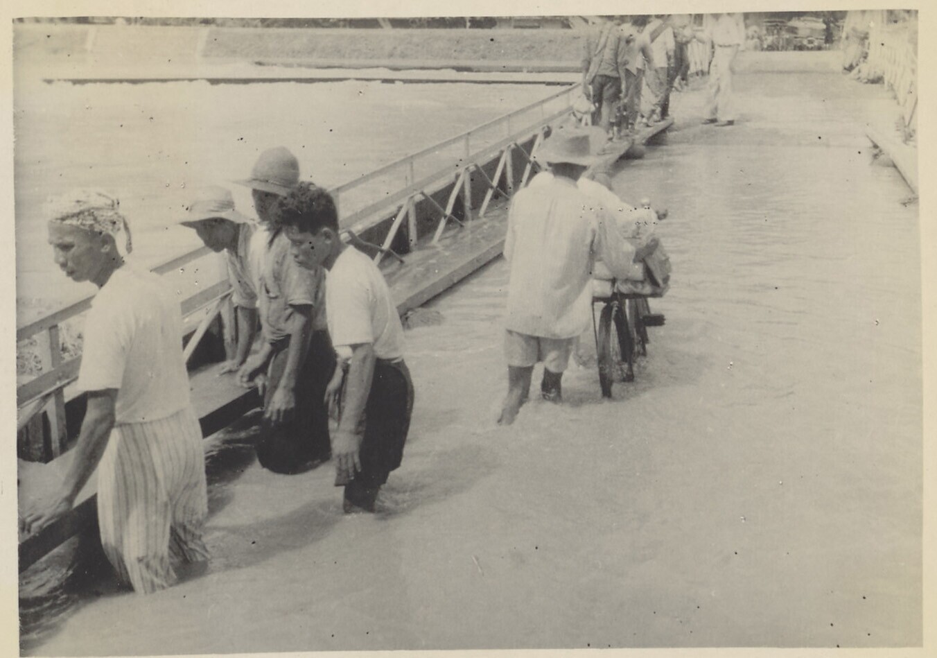 Fam. Bokma bij overstroomde brug te Indramajoe