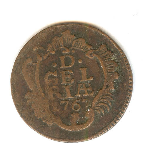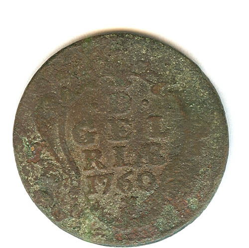 Duit met op de voorzijde D GEL RIAE en jaartal gesie...