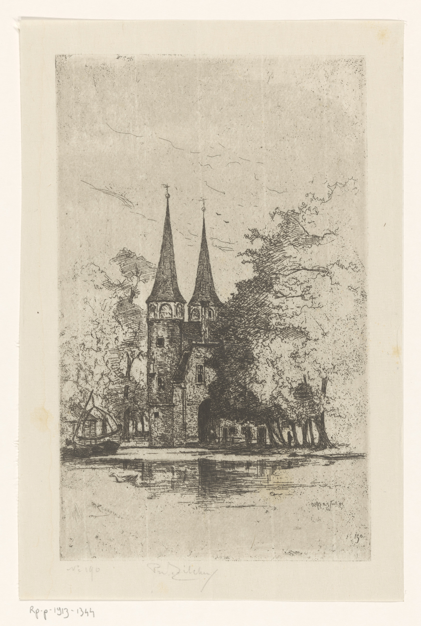 Gezicht vanaf de gracht op de Oostpoort, te Delft