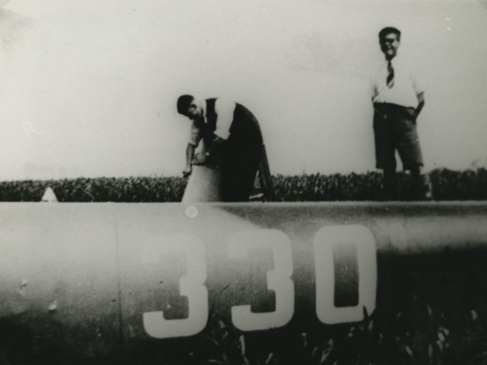 Foto twee jongens op staartstuk Fokker G-1 330 na no...