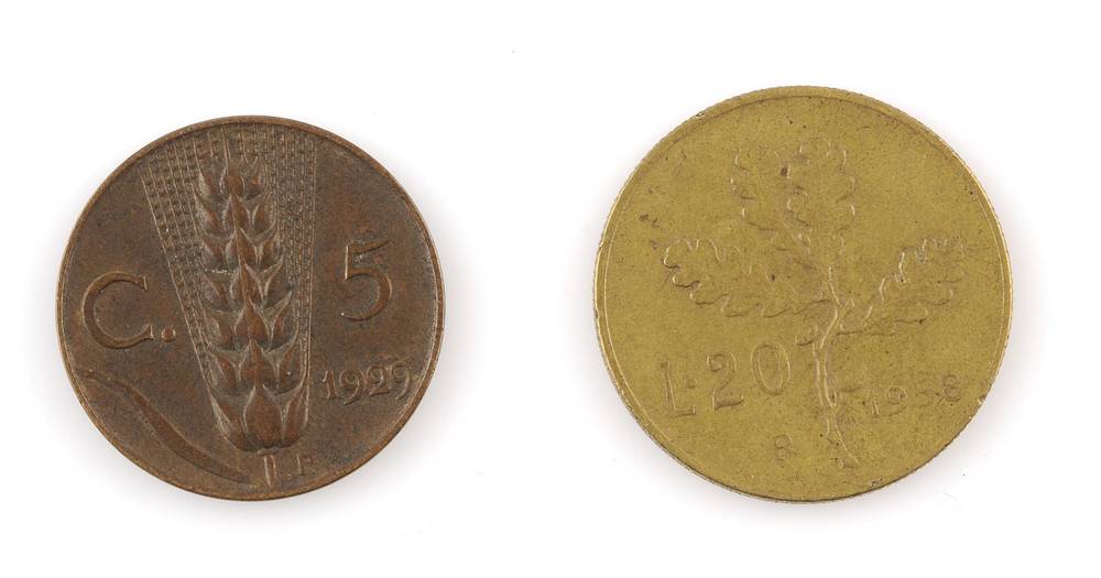 twee munten : 5 cnts 1929 en 20 lire 1958