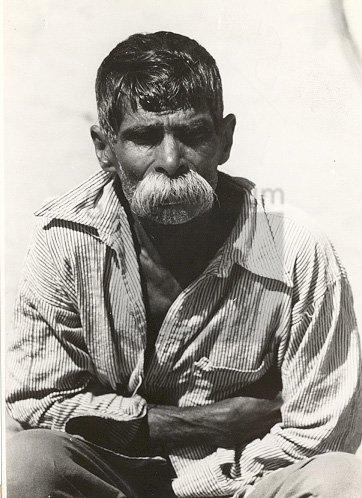 Oude Batak man zittend bij sculpturen, Sumatra, Indo...