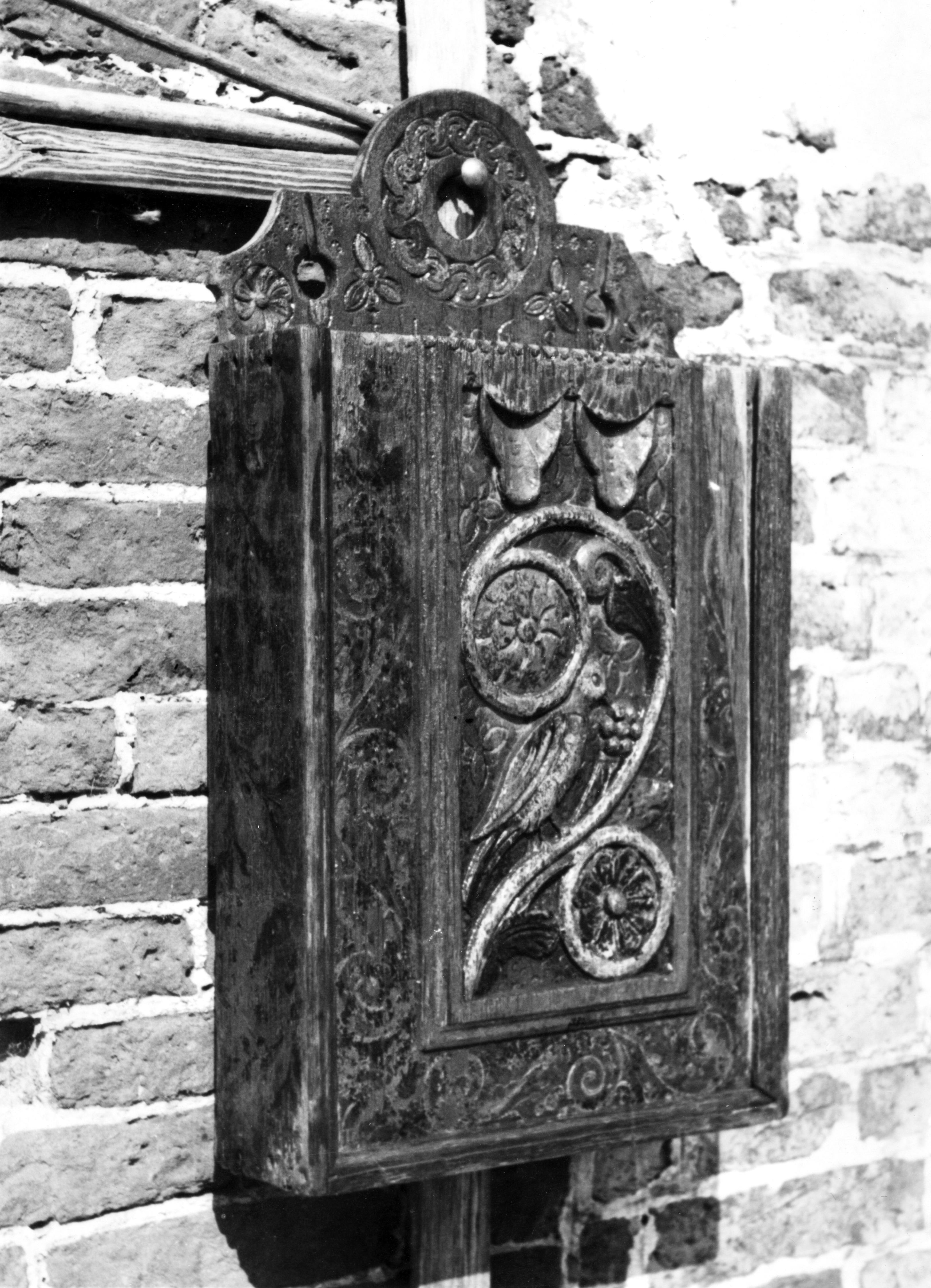 Houten schooltas uit Hindeloopen, 1944 (zwart-wit foto)