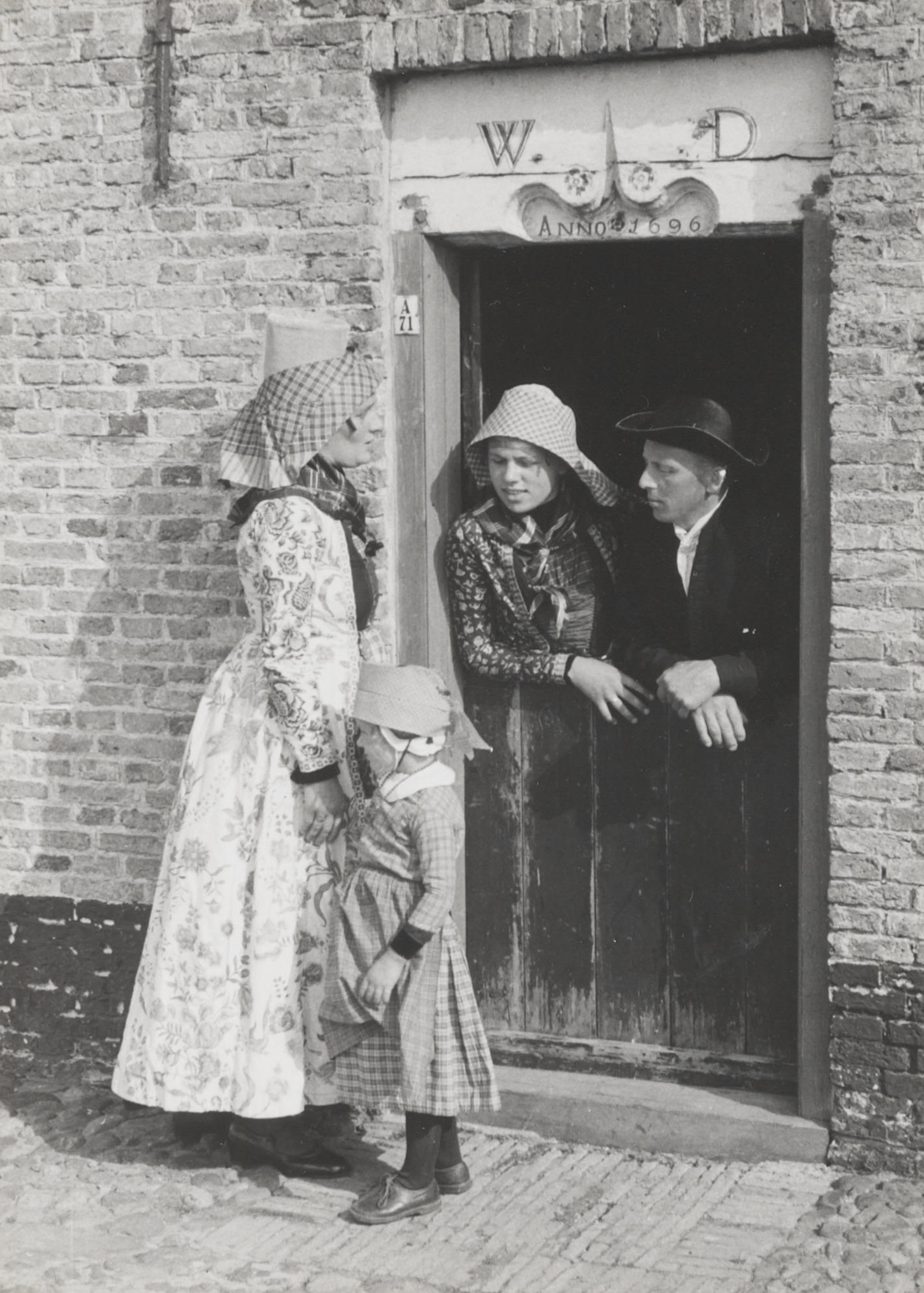 Meisjes, vrouw en man, verkleed in Hindelooper drach...
