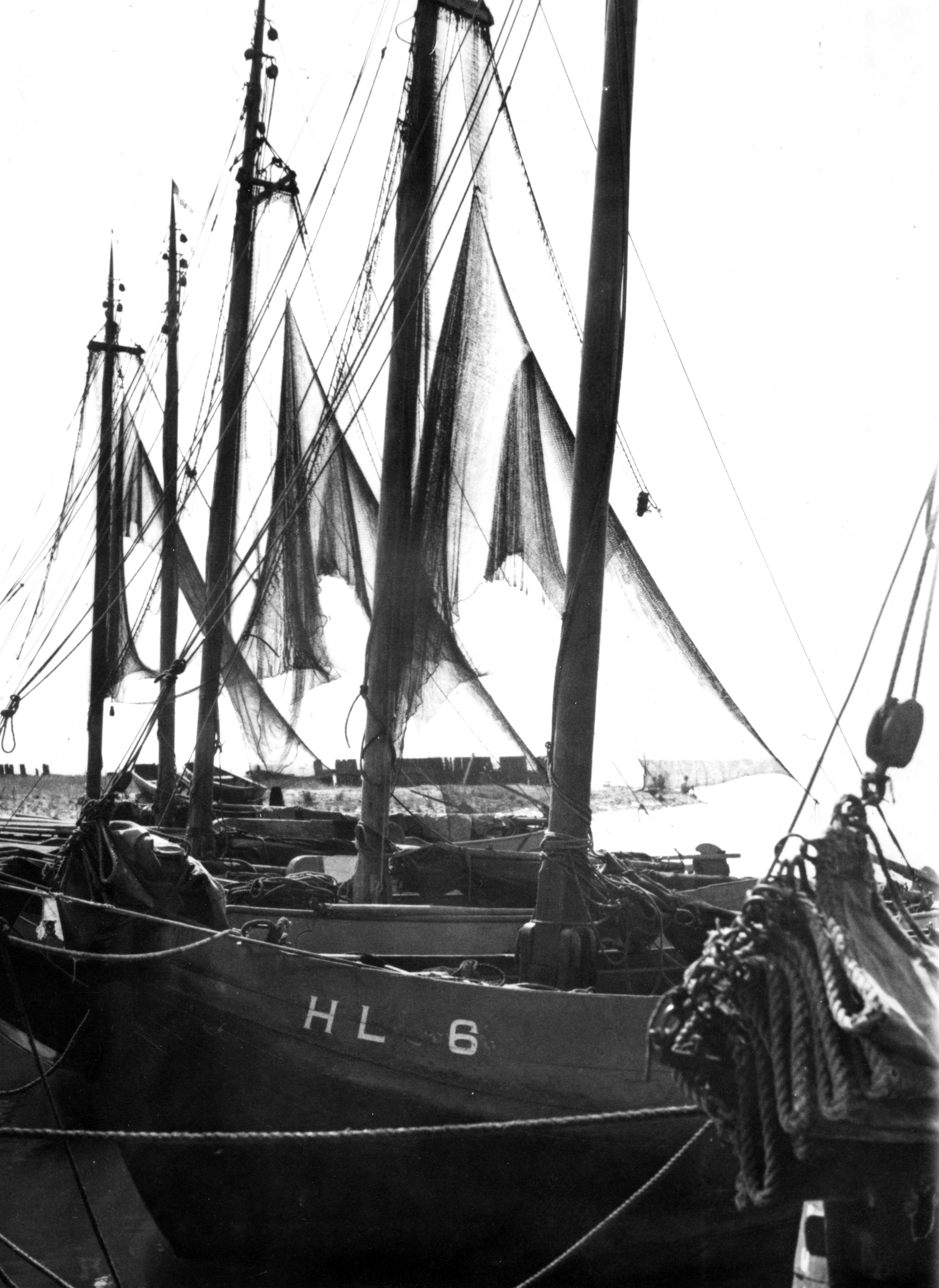 Visnetten aan scheepsmasten, Laaxum, 1944 (zwart-wit...