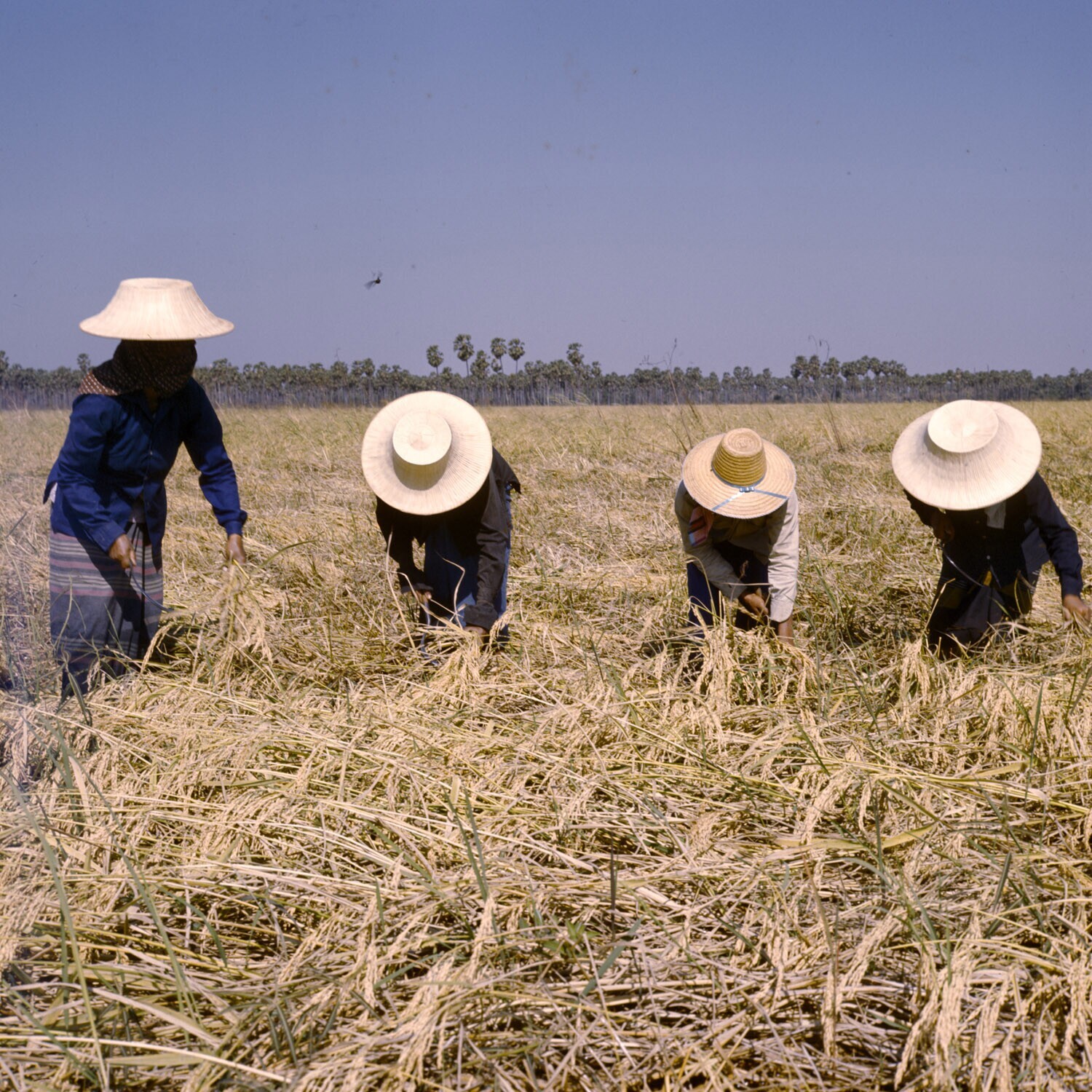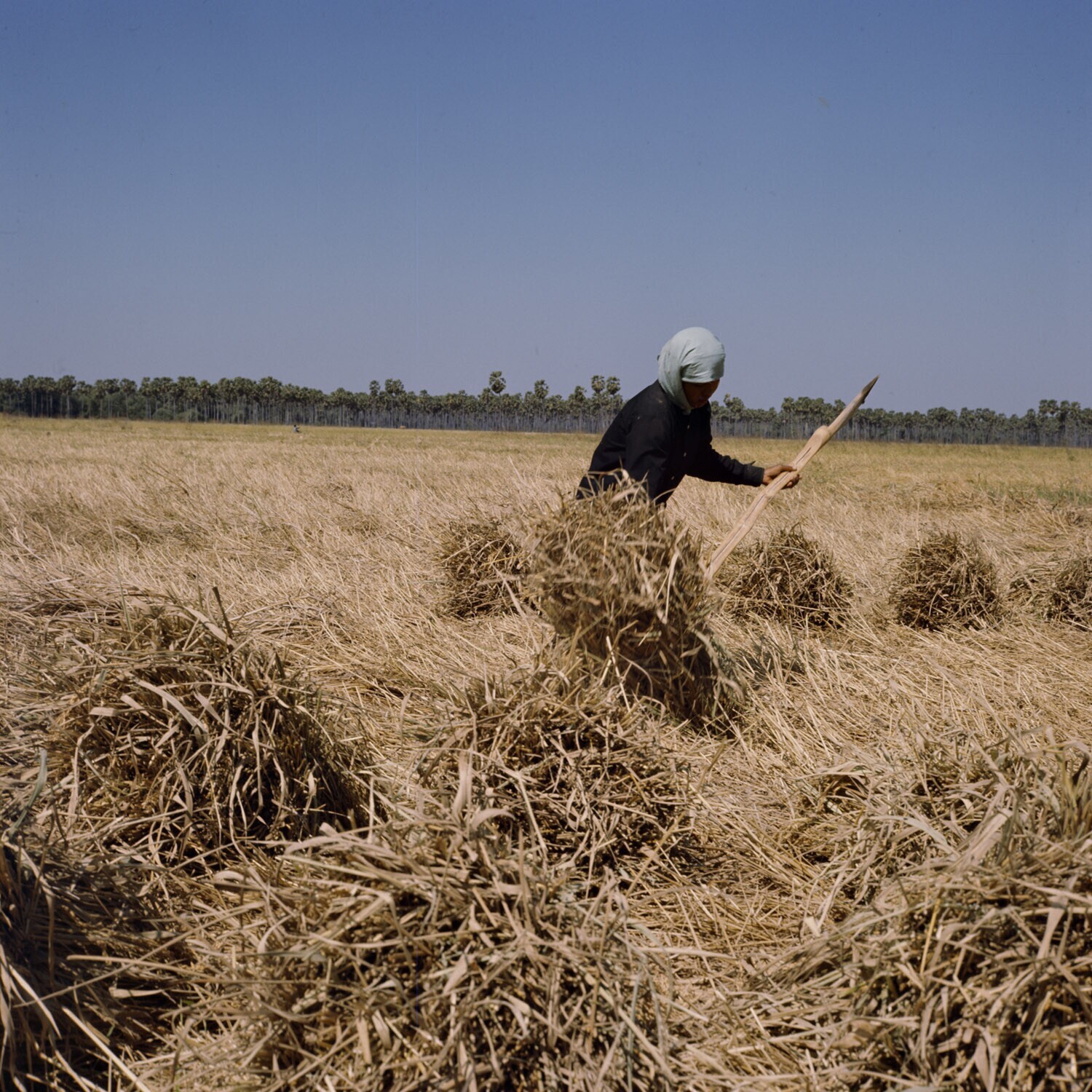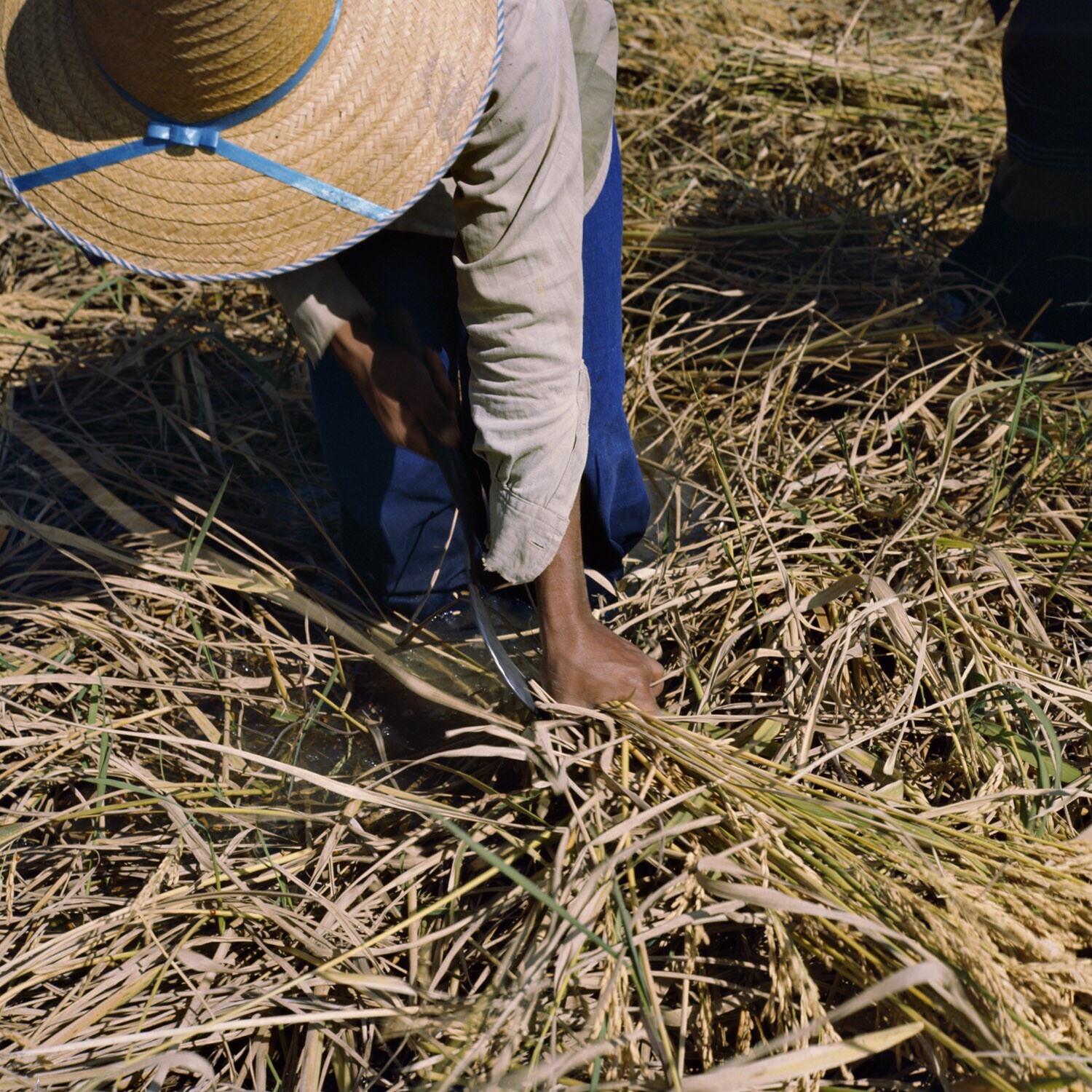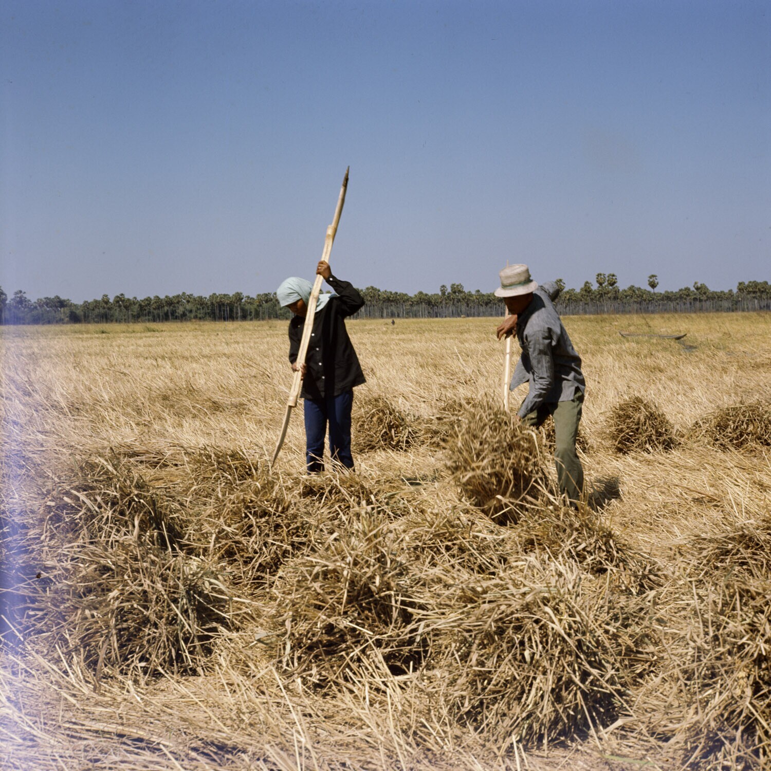 Rijstoogst De rijsthalmen worden afgesnlen met een s...