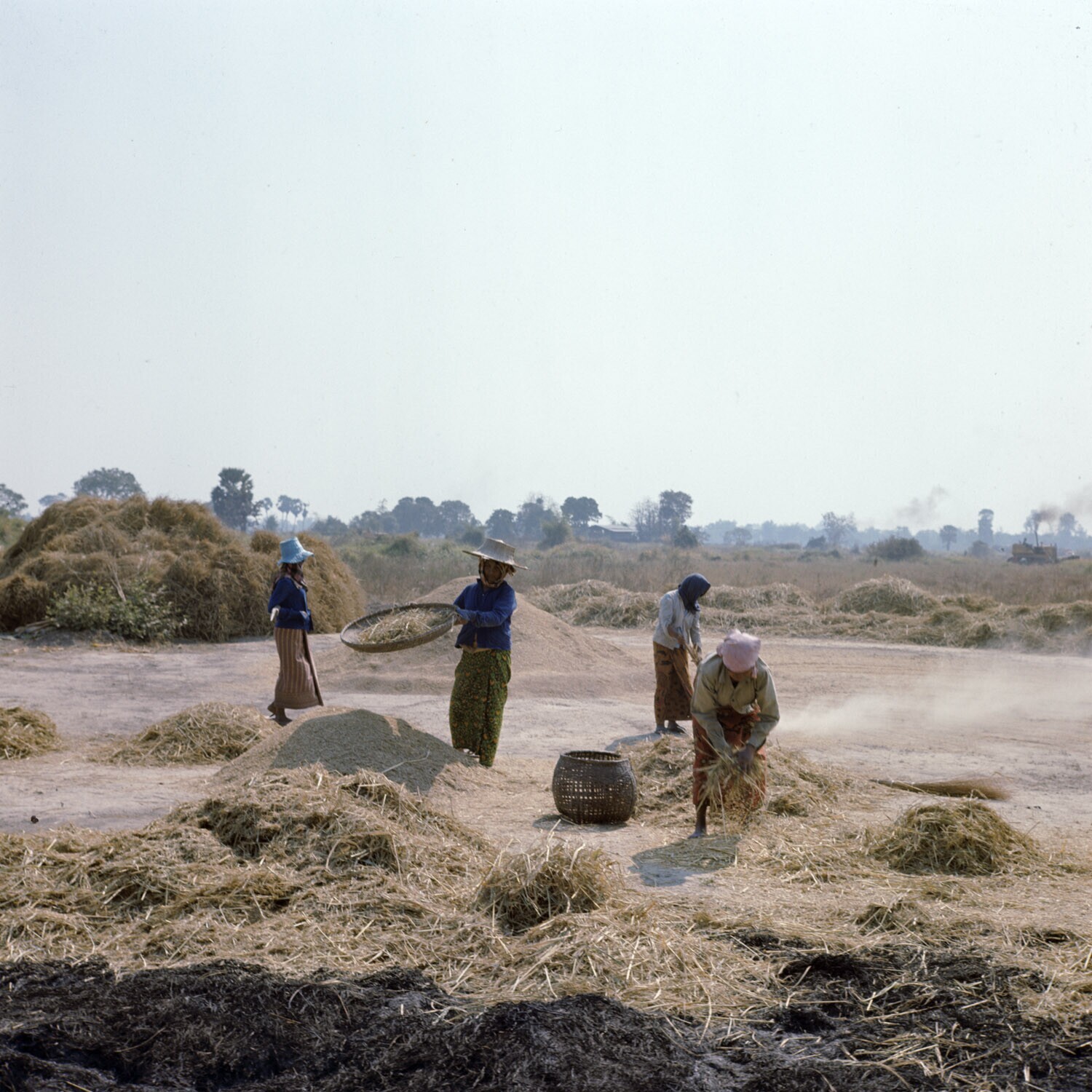 Na het wannen wordt de rijst op hopen geschoven om d...