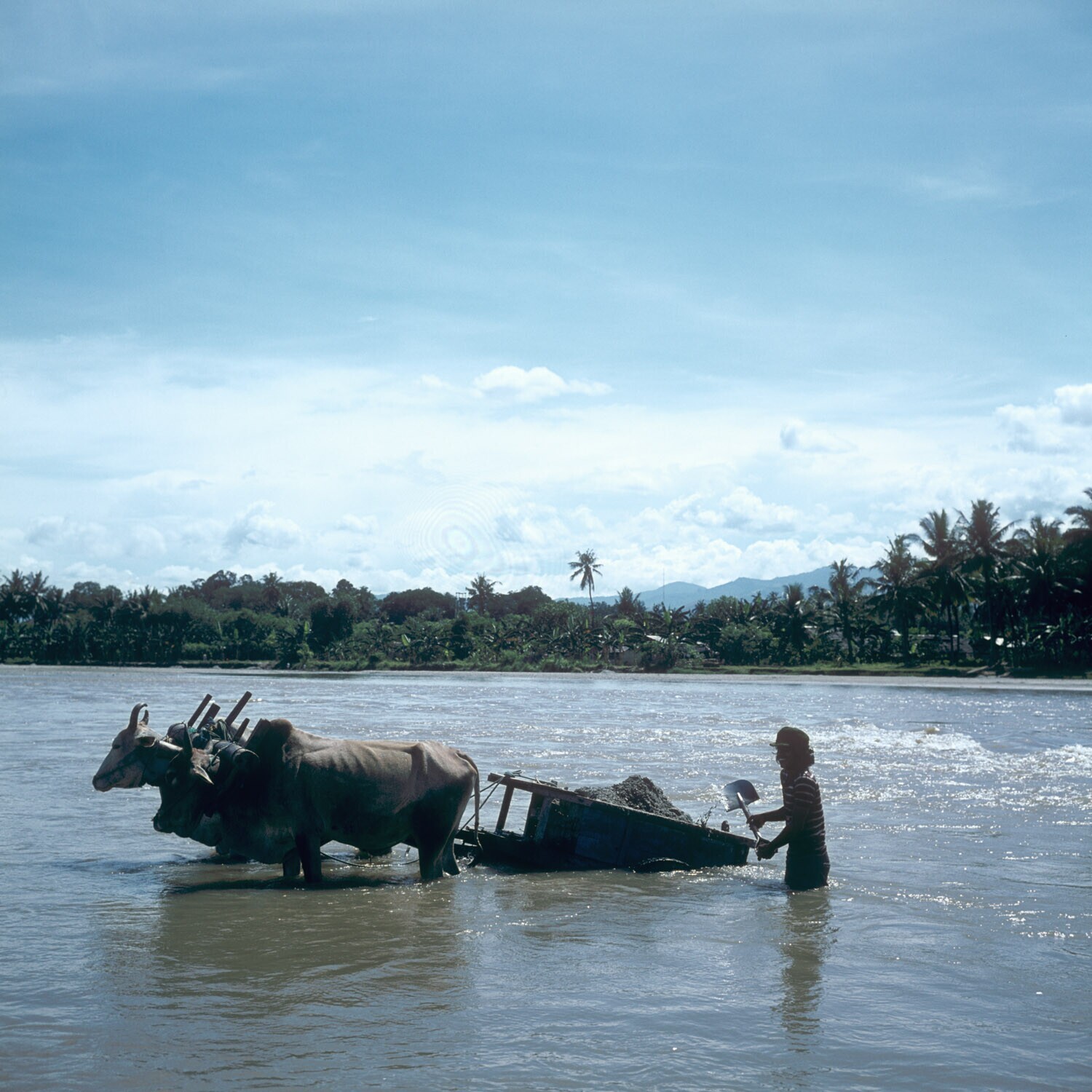 Een man haalt vruchtbaar slib uit de rivier, de kar ...