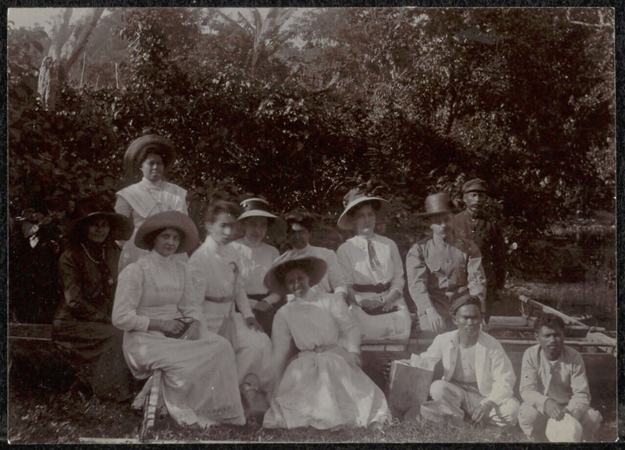 Groepsportret van mensen in paardenkoetsen, gemaakt ...