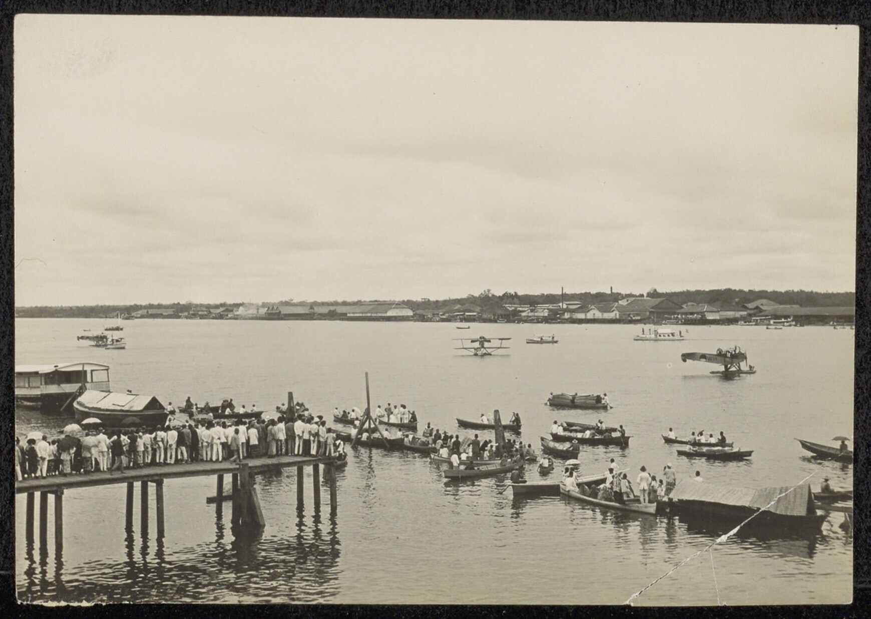 Mensen kijken vanaf een steiger en vanuit boten naar...