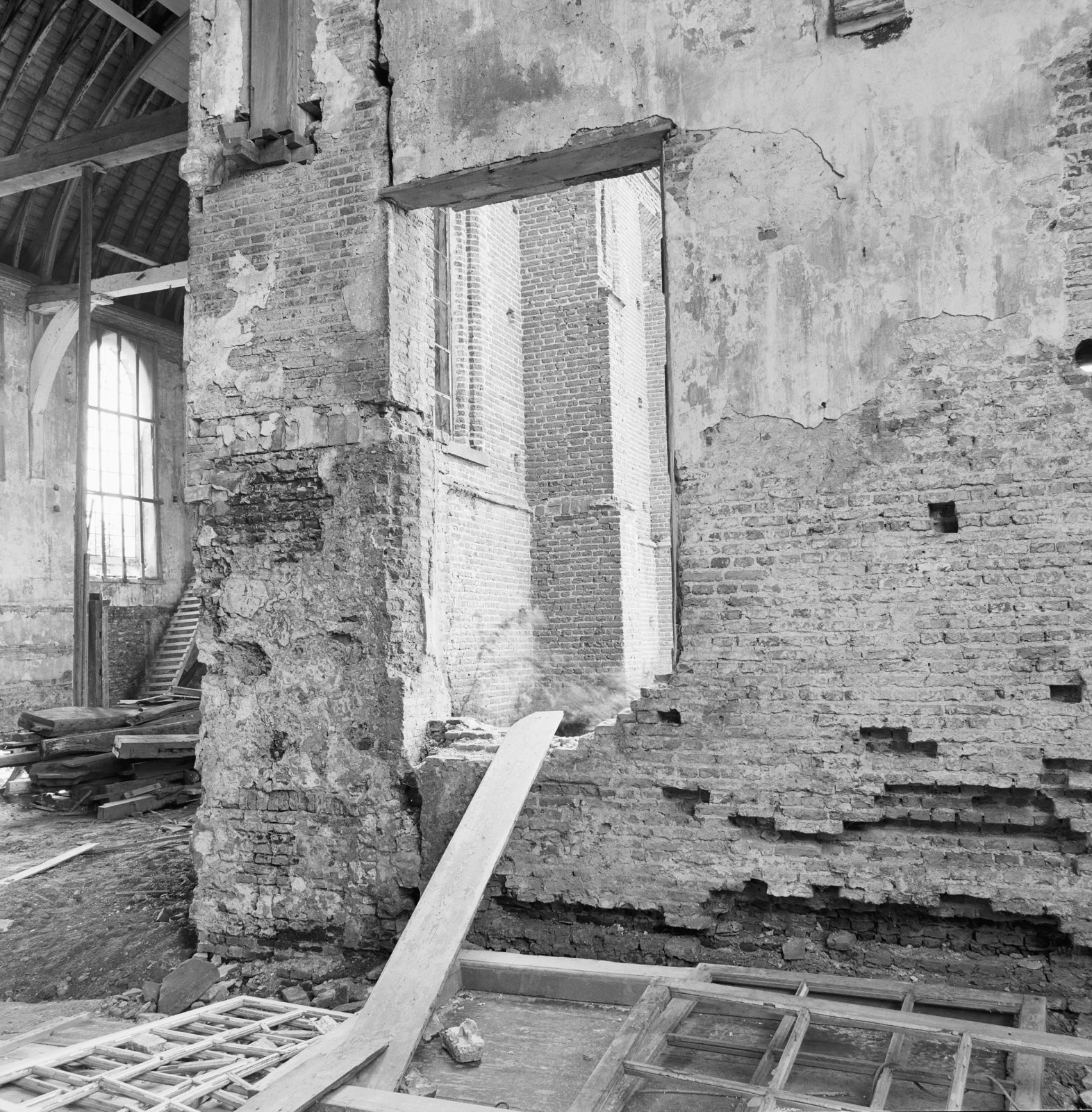 Interieur westwand dwarsschip tijdens restauratie