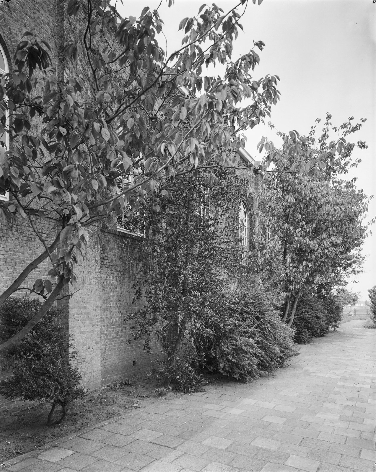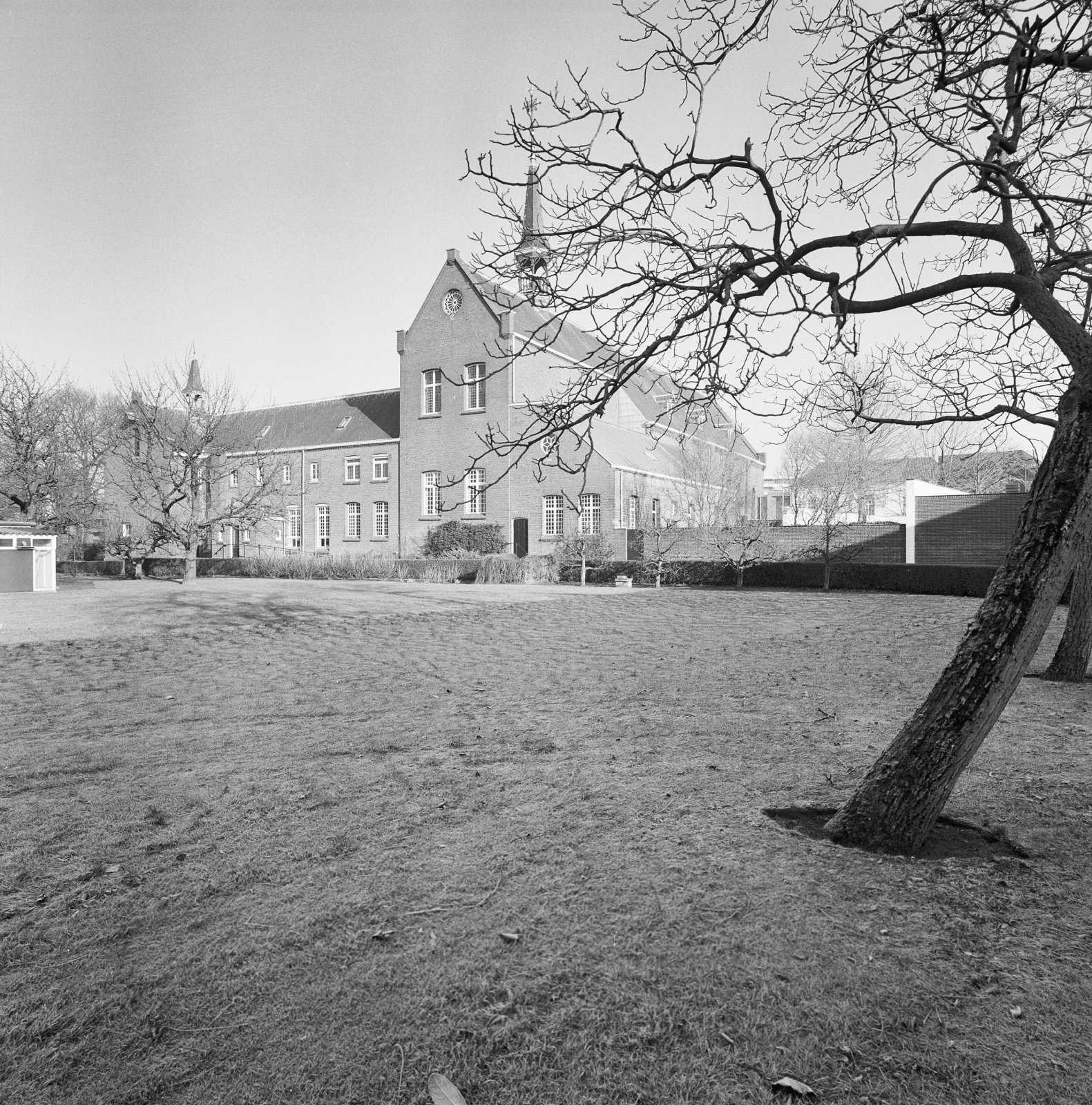 Overzicht vanuit de tuin, links het klooster en rech...