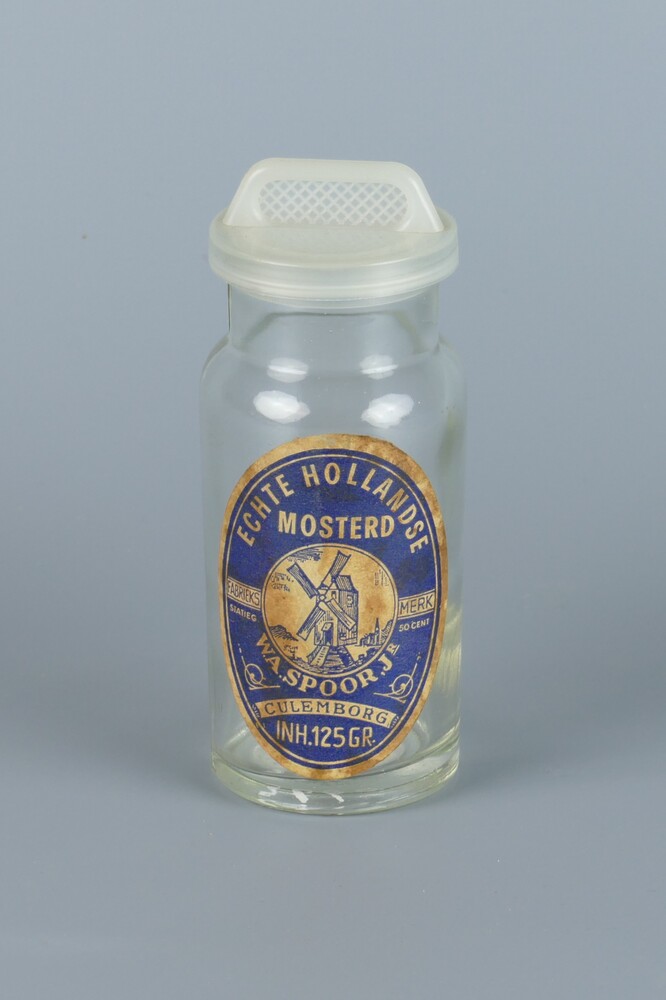 mosterdpot van kleurloos glas, met plastic stop, gea...