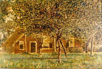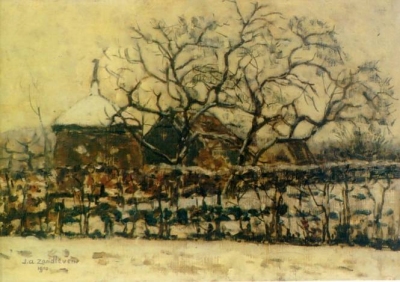 Boerderij in de sneeuw, op de voorgrond heg en twee ...