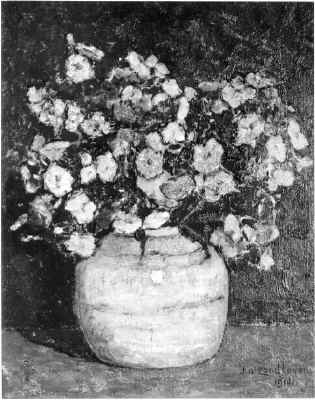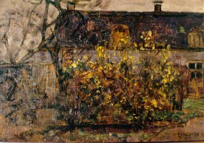 Huizenblok, met geelbloeiende struiken op de voorgrond