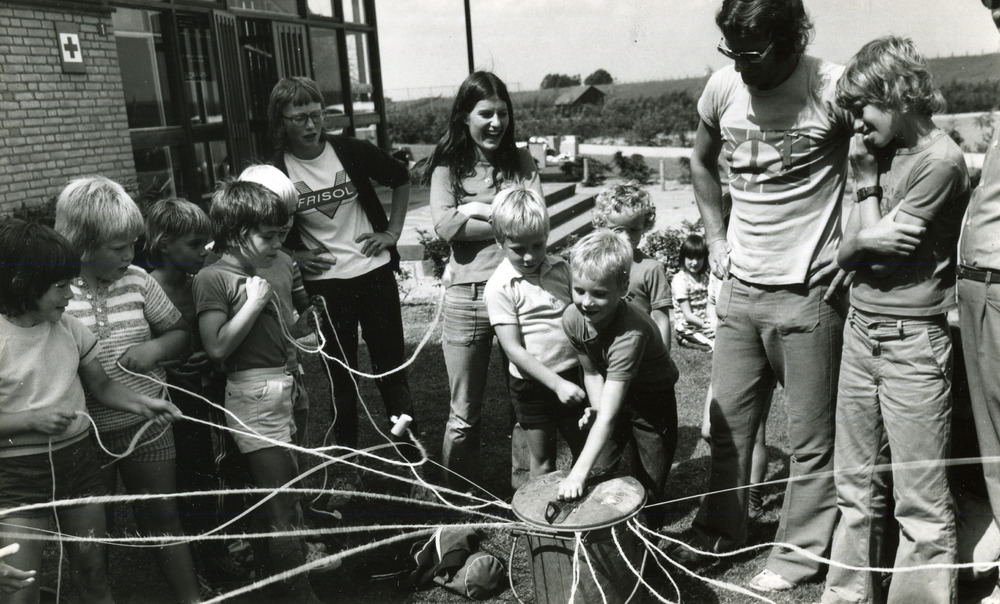Zwart-wit foto van kinderspelen te Lobith in juni 1975