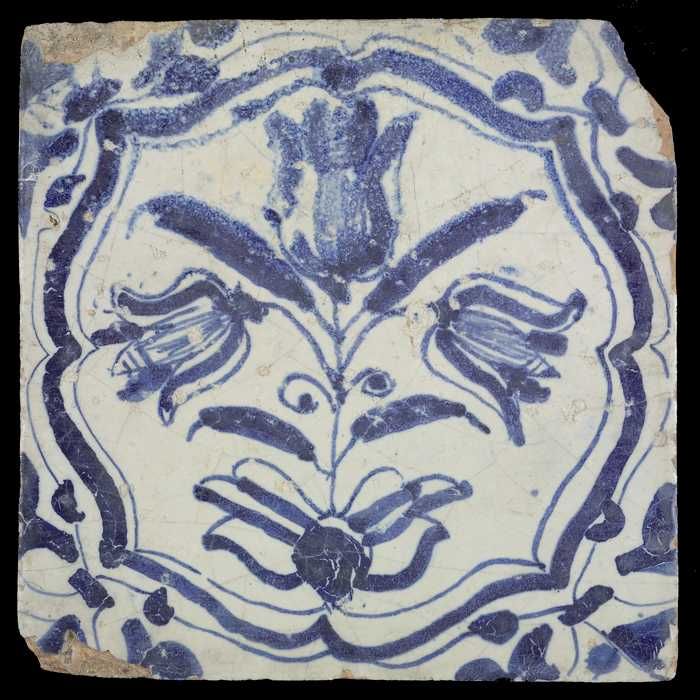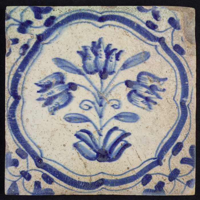 Bloemtegel met drietulp in accolades, blauw decor op...