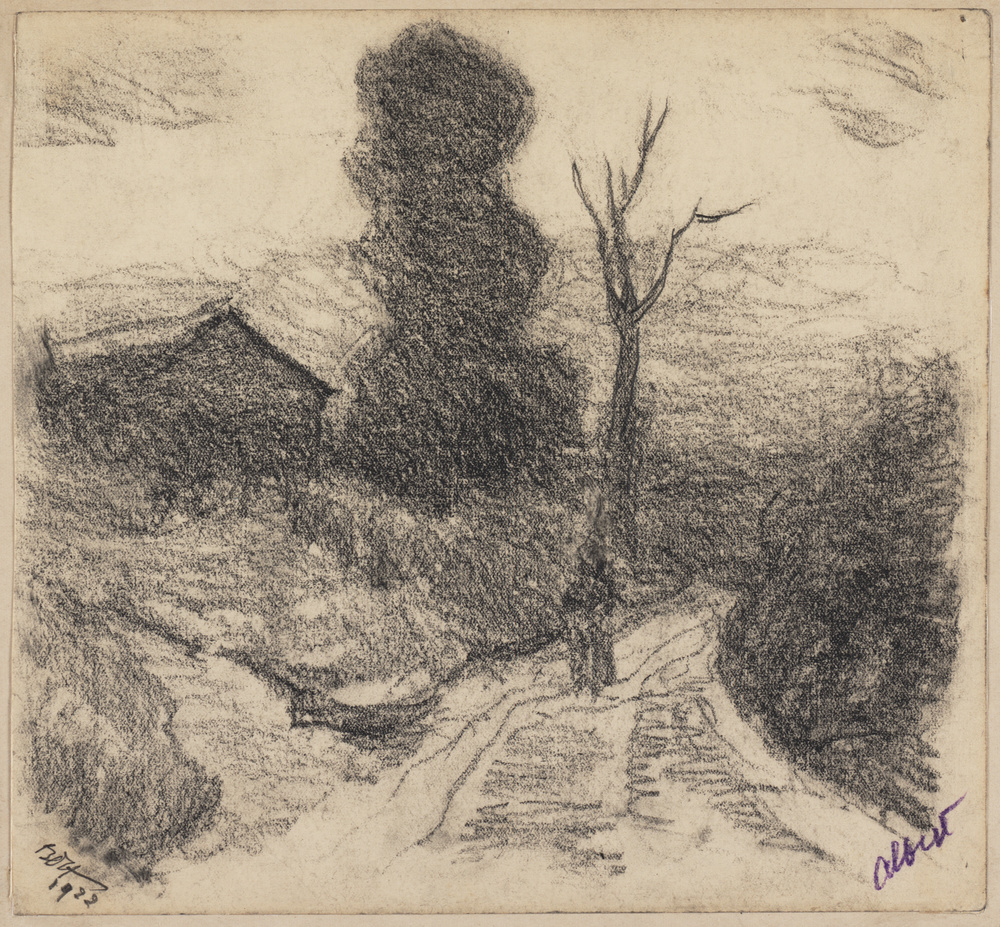 Reiziger op een landweg, links een huis en bomen