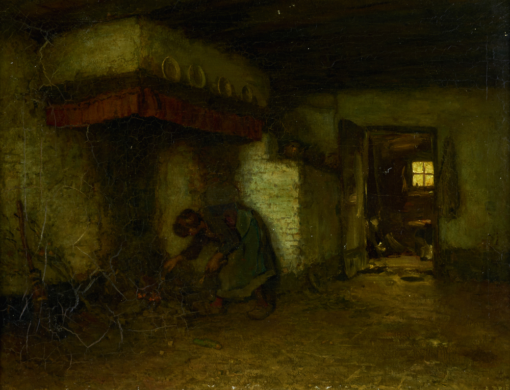 Interieur met vrouw bij de haard
