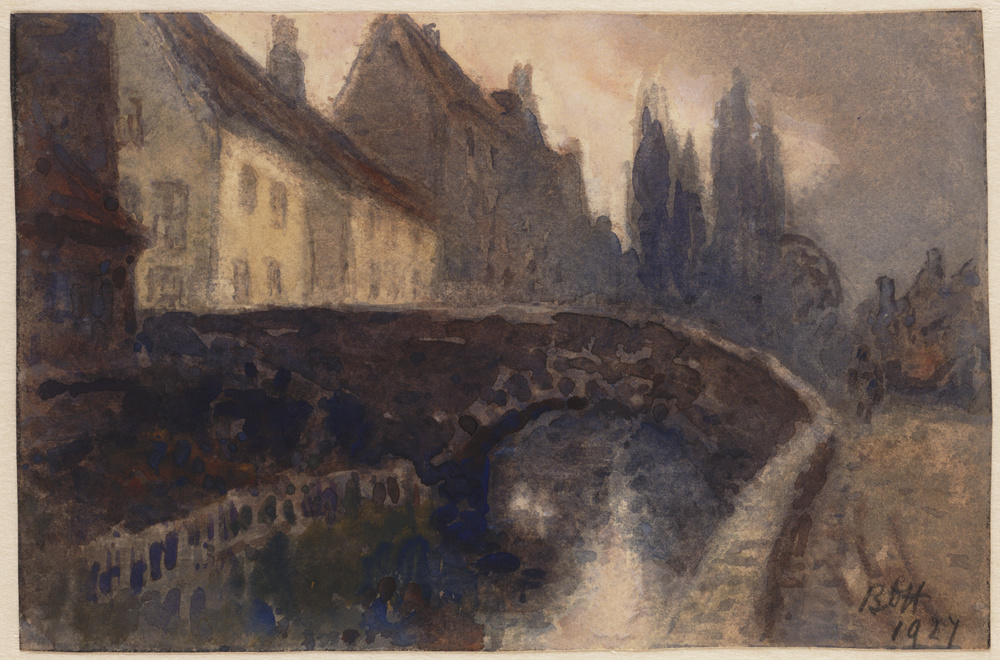 Huizen met een brug over het water en in de verte co...