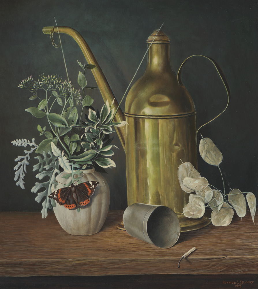 Stilleven met geelkoperen tuitkan