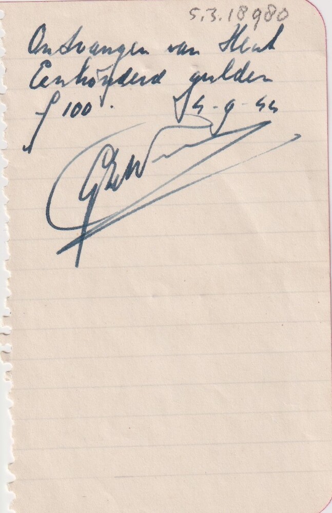 Velletje papier met tekst: "Ontvangen van Henk een h...