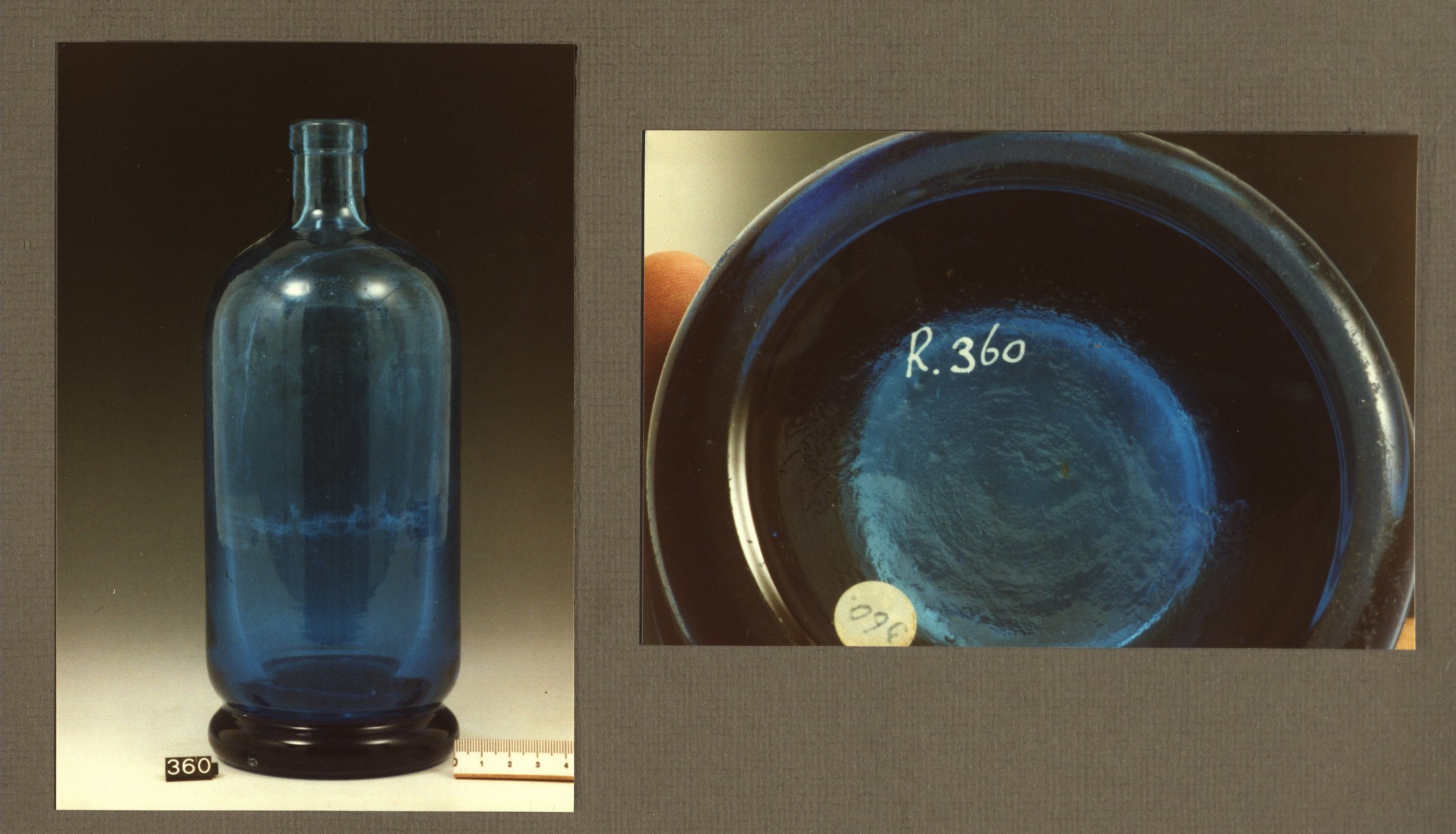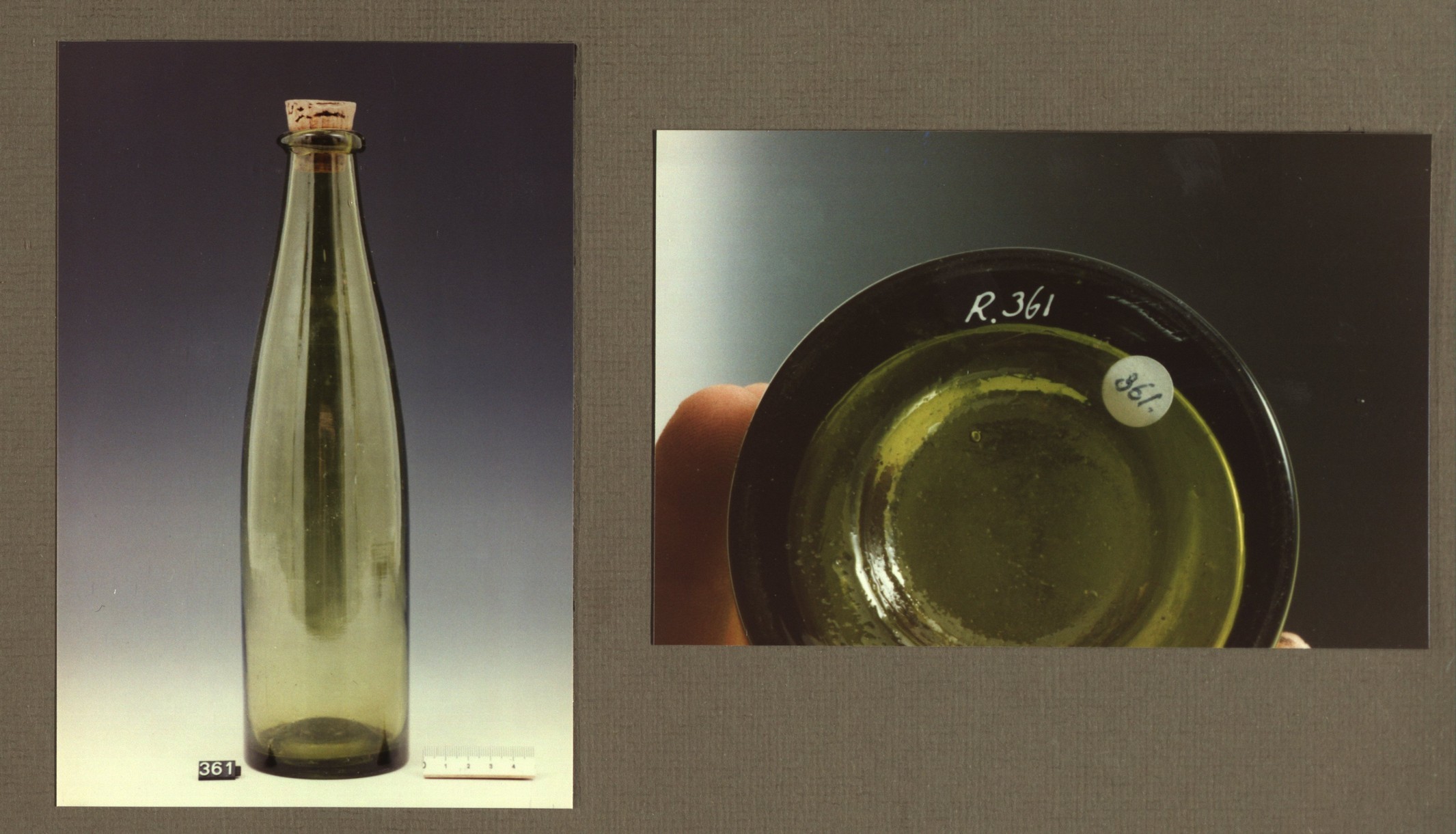 Zgn. posteleinfles. Gelig groen glas. Van onderen na...